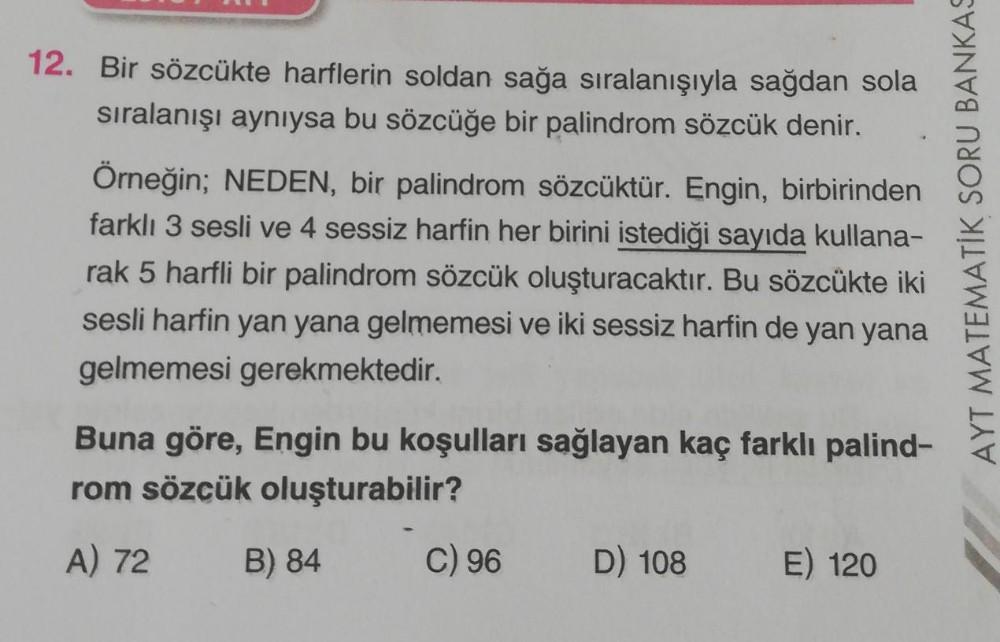 12. Bir sözcükte harflerin soldan sağa sıralanışıyla sağdan sola sıralanışı aynıysa bu sözcüğe bir palindrom sözcük denir. Örneğin; NEDEN, bir palindrom sözcüktür. Engin, birbirinden farklı 3 sesli ve 4 sessiz harfin her birini istediği sayıda kullana- rak 5 harfli bir palindrom sözcük oluşturacaktır. Bu sözcükte iki sesli harfin yan yana gelmemesi ve iki sessiz harfin de yan yana gelmemesi gerekmektedir. AYT MATEMATİK SORU BANKAS Buna göre, Engin bu koşulları sağlayan kaç farklı palind- rom sözcük oluşturabilir? A) 72 B) 84 C) 96 D) 108 E) 120