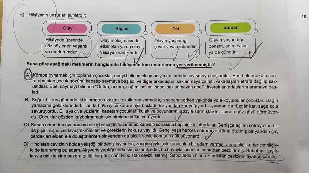 12. Hikâyenin unsurları şunlardır: 15. Olay Kişiler Yer Zaman Hikâyede üzerinde söz söylenen yaşantı ya da durumdur. Olayın oluşmasında etkili olan ya da olayı yaşayan varlıklardır. Olayın yaşandığı çevre veya mekândır. Olayın yaşandığı dönem, an mevsim ya da gündür. Buna göre aşağıdaki metinlerin hangisinde hikâyenin tüm unsurlarına yer verilmemiştir? A) Körebe oynamak için toplanan çocuklar, ebeyi belirlemek amacıyla aralarında sayışmaya başladılar. Ebe bulunduktan son- ra ebe olan çocuk gözünü kapatıp saymaya başladı ve diğer arkadaşları saklanmaya çalıştı. Arkadaşları etrafa dağılıp sak- landılar. Ebe, saymayı bitirince "Önüm, arkam, sağım, solum, sobe; saklanmayan ebe!" diyerek arkadaşlarını aramaya baş- ladı. B) Soğuk bir kış gününde iki kilometre uzaktaki okullarına varmak için sabahın erken vaktinde yola koyuldular çocuklar. Dağın yamacına geldiklerinde bir anda hava iyice kararmaya başladı. Bir yandan kar yağıyor bir yandan da rüzgâr karı sağa sola savuruyordu. El, ayak ve yüzlerini kapatan çocuklar; kulak ve boyunlarını atkıyla sarmışlardı. Tipiden göz gözü görmüyor- du. Çocuklar gözden kaybolmamak için birbirine yakın yürüyordu. C) Sabah erkenden uyanan ev halkı, bahçede hazırlanan kahvaltı sofrasına hep birlikte oturdular. Genişçe açılan sofraya tandir- da pişirilmiş sıcak lavaş ekmekleri ve çöreklerin kokusu yayıldı. Genç, yaşlı herkes sofranın etrafına dizilmiş bir yandan çay bardakları elden ele dolaştırılırken bir yandan da alçak sesle konuşup gülüşüyorlardı. D) Hindistan cevizinin bolca yetiştiği bir deniz kıyısında, zenginliğiyle çok konuşulan bir adam varmış. Zenginliği kadar cimriliğiy- le de tanınırmış bu adam. Alışveriş yaptığı herkesle pazarlık eder, bu huyuyla insanları canından bezdirirmiş. Sabahın ilk ışık- larıyla birlikte yine pazara gittiği bir gün, canı Hindistan cevizi istemiş. Satıcılardan birine Hindistan cevizinin fiyatını sormuş.