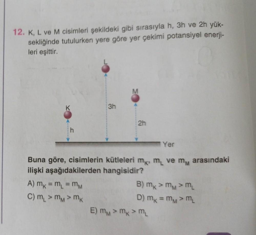 12. K, L ve M cisimleri şekildeki gibi sırasıyla h, 3h ve 2h yük- sekliğinde tutulurken yere göre yer çekimi potansiyel enerji-