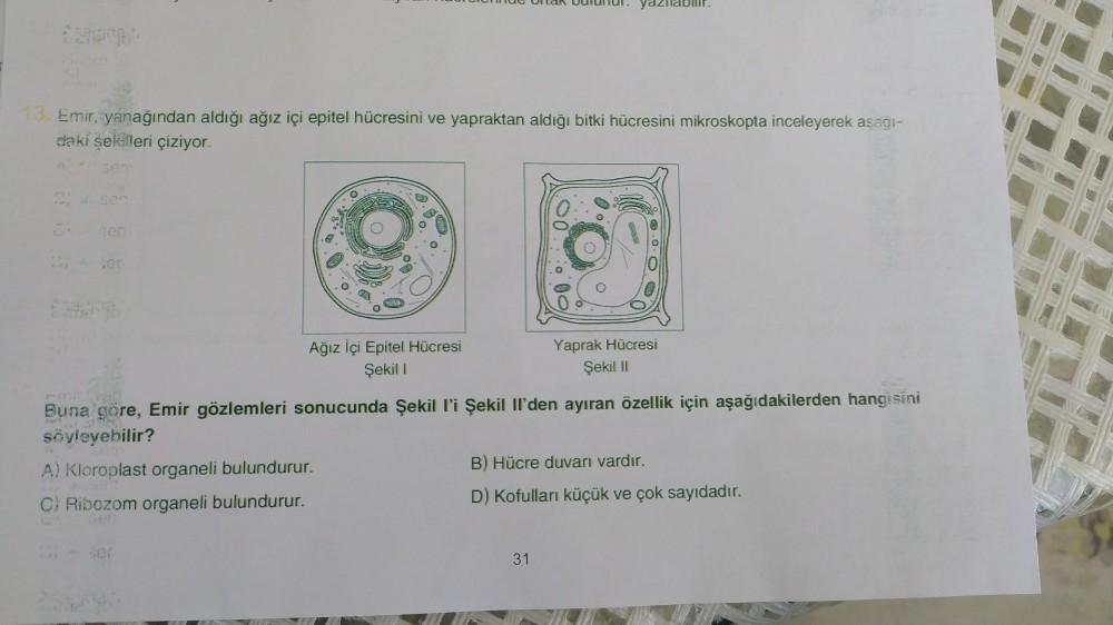 13. Emir, yanağından aldığı ağız içi epitel hücresini ve yapraktan aldığı bitki hücresini mikroskopta inceleyerek aşağı- daki şekilleri çiziyor. sem C Ağız İçi Epitel Hücresi Şekil I Tue onak bulunur. yazılabilir. A) Kloroplast organeli bulundurur. C) Ribozom organeli bulundurur. FOLL Buna göre, Emir gözlemleri sonucunda Şekil l'i Şekil Il'den ayıran özellik için aşağıdakilerden hangisini söyleyebilir? Yaprak Hücresi Şekil II B) Hücre duvarı vardır. D) Kofulları küçük ve çok sayıdadır. 31