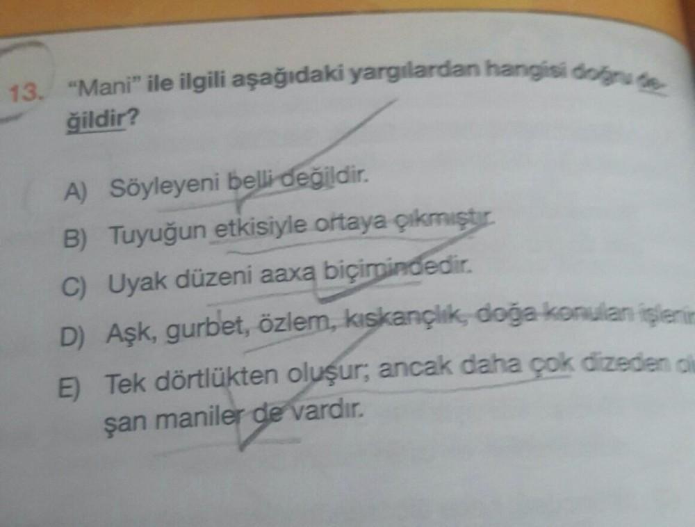13. "Mani" ile ilgili aşağıdaki yargılardan hangisinde ğildir? A) Söyleyeni belli değildir. B) Tuyuğun etkisiyle ortaya çıkmıştır C) Uyak düzeni aaxa biçimindedir . D) Aşk, gurbet, özlem, kıskançlık, doğa konulan işlenin E) Tek dörtlükten oluşur; ancak daha çok dizedeno şan maniler de vardır.