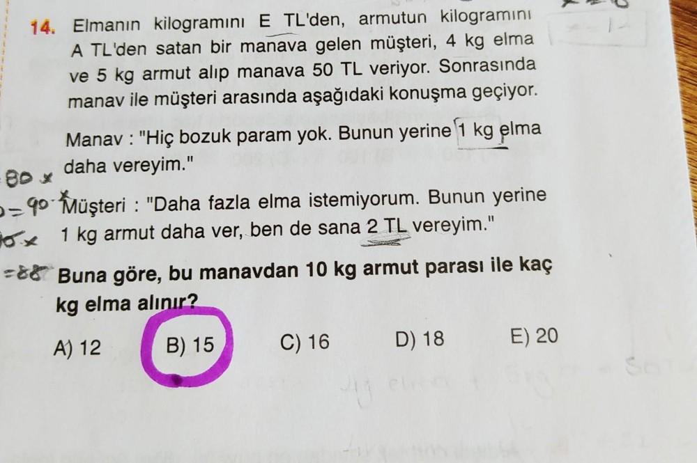 14. Elmanın kilogramını E TL'den, armutun kilogramını A TL'den satan bir manava gelen müşteri, 4 kg elma ve 5 kg armut alıp manava 50 TL veriyor. Sonrasında manav ile müşteri arasında aşağıdaki konuşm