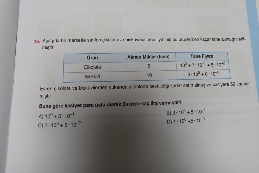 15. Aşağıda bir markette satılan çikolata ve bisküvinin tane fiyatı ile bu ürünlerden kaçar tane alındığı veril- miştir. Ürün Alinan Miktar (tane) Tane Fiyatı Çikolata 6 100+ 7.10-1 +5.10-2 Bisküvi 10 3. 10° +8.10-1 Evren çikolata ve bisküvilerden yukarıdaki tabloda belirtildiği kadar satın almış ve kasiyere 50 lira ver- miştir. Buna göre kasiyer para üstü olarak Evren'e kaç lira vermiştir? A) 10° +5.10-1 B) 2. 10° +5.10-1 C) 2. 10° +5.10-2 D) 1. 10° +5.10-2