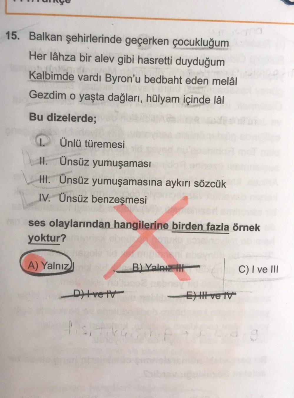 15. Balkan şehirlerinde geçerken çocukluğum Her lâhza bir alev gibi hasretti duyduğum Kalbimde vardı Byron'u bedbaht eden melâl Gezdim o yaşta dağları, hülyam içinde lâl Bu dizelerde; 1. Ünlü türemesi II. Ünsüz yumuşaması III. Ünsüz yumuşamasına aykırı sözcük IV. Ünsüz benzeşmesi ses olaylarından hangilerine birden fazla örnek yoktur? A) Yalnız B) Yalnız II C) I ve III Ditve tv Et ve tv fistika