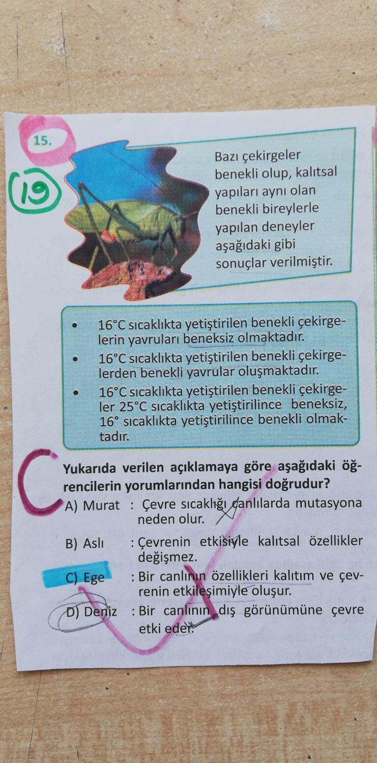 15. Bazı çekirgeler benekli olup, kalıtsal yapıları aynı olan benekli bireylerle yapılan deneyler aşağıdaki gibi sonuçlar verilmiştir. . 16°C sıcaklıkta yetiştirilen benekli çekirge- lerin yavruları beneksiz olmaktadır. 16°C sıcaklıkta yetiştirilen benekli çekirge- lerden benekli yavrular oluşmaktadır. 16°C sıcaklıkta yetiştirilen benekli çekirge- ler 25°C sıcaklıkta yetiştirilince beneksiz, 16° sıcaklıkta yetiştirilince benekli olmak- tadır. C Yukarıda verilen açıklamaya göre aşağıdaki öğ- rencilerin yorumlarından hangisi doğrudur? A) Murat : Çevre sıcaklığı danlılarda mutasyona neden olur. : Çevrenin etkisiyle kalıtsal özellikler değişmez. C) Ege : Bir canlının özellikleri kalıtım ve çev- renin etkileşimiyle oluşur. D) Deniz : Bir canlının dış görünümüne çevre etki eder. B) Asli