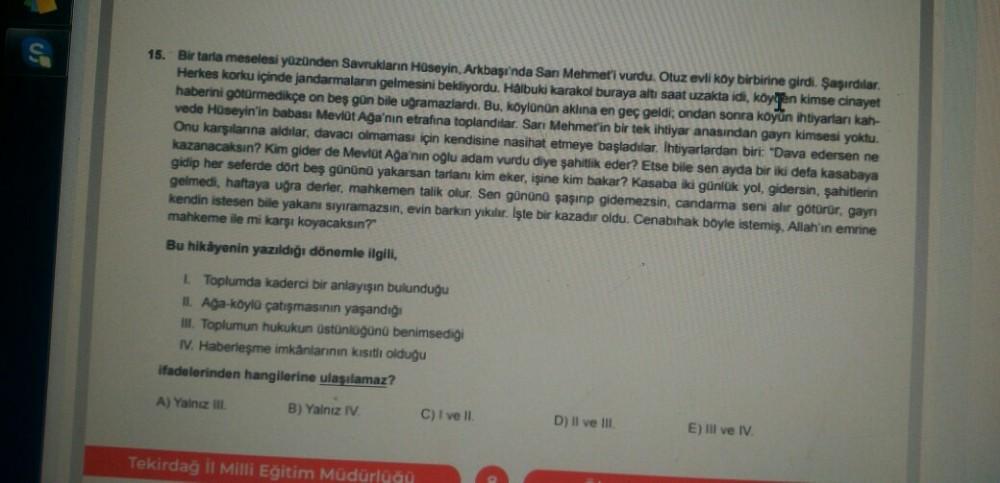 15. Bir tarla meselesi yüzünden Savrukların Hüseyin, Arkbaşı'nda San Mehmet'i vurdu. Otuz evli köy birbirine girdi. Şaşırdılar. Herkes korku içinde jandarmaların gelmesini bekliyordu. Halbuki karakol buraya alt saat uzakta idi, koyqlen kimse cinayet haberini goturmedikçe on beş gün bile ugramazlardı. Bu, köylünün aklına en geç geldi; ondan sonra koyün ihtiyarları kah- vede Hüseyin'in babası Mevlüt Ağa'nın etrafına toplandılar. Sarı Mehmet'in bir tek ihtiyar anasından gayn kimsesi yoktu. Onu karşılanına aldılar, davacı olmaması için kendisine nasihat etmeye başladılar. Ihtiyarlardan biri: "Dava edersen ne kazanacaksın? Kim gider de Mevlüt Aga'nın oğlu adam vurdu diye şahitlik eder? Else bile sen ayda bir iki defa kasabaya gidip her seferde dort beş gününü yakarsan tarianı kim eker, işine kim bakar? Kasaba iki günlük yol, gidersin, şahitlerin gelmedi, haftaya uğra derler, mahkemen talik olur. Sen gününü şaşınıp gidemezsin, candarma seni alır götürür, gaynı kendin istesen bile yakanı sıyıramazsin, evin barkin yıkılur. İşte bir kazadir oldu. Cenabihak boyle istemiş, Allah'ın emrine mahkeme ile mi karşı koyacaksın? Bu hikayenin yazıldığı dönemle ilgili, Toplumda kaderci bir anlayışın bulunduğu II. Ağa-köylü çatışmasının yaşandığı III. Toplumun hukukun Istünlüğünü benimsediği IV. Haberleşme imkanlarının kısıtlı olduğu ifadelerinden hangilerine ulaşılamaz? A) Yalnız lll. B) Yalnız IV C) I ve II D) Il ve III E) III ve IV Tekirdağ il Milli Eğitim Müdürlüğü