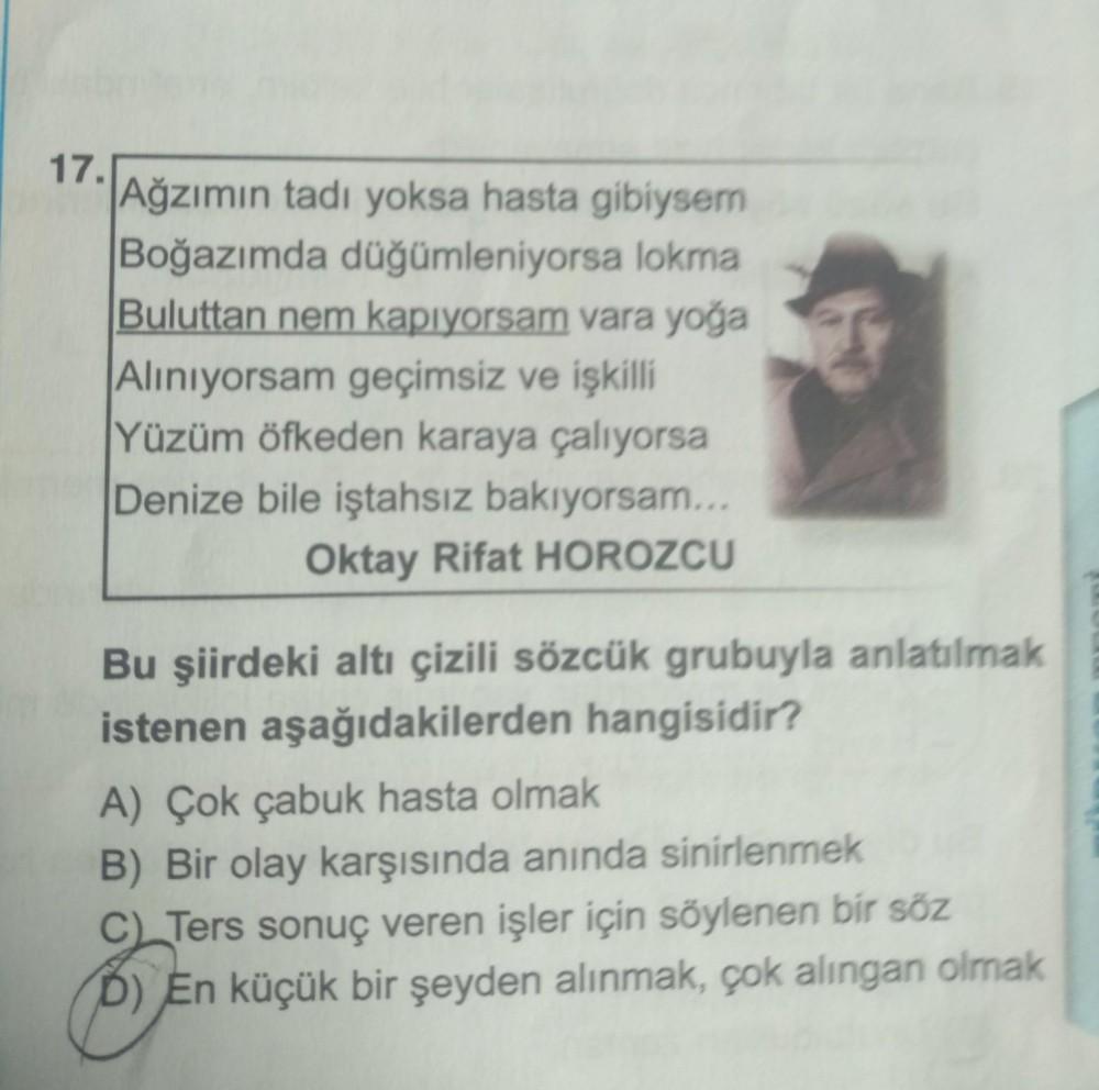 17. |Ağzımın tadı yoksa hasta gibiysem Boğazımda düğümleniyorsa lokma Buluttan nem kapıyorsam vara yoga Aliniyorsam geçimsiz ve işkilli Yüzüm öfkeden karaya çalıyorsa Denize bile iştahsız bakıyorsam... Oktay Rifat HOROZCU Bu şiirdeki altı çizili sözcük grubuyla anlatılmak istenen aşağıdakilerden hangisidir? A) Çok çabuk hasta olmak B) Bir olay karşısında anında sinirlenmek C Ters sonuç veren işler için söylenen bir söz D) En küçük bir şeyden alınmak, çok alıngan olmak
