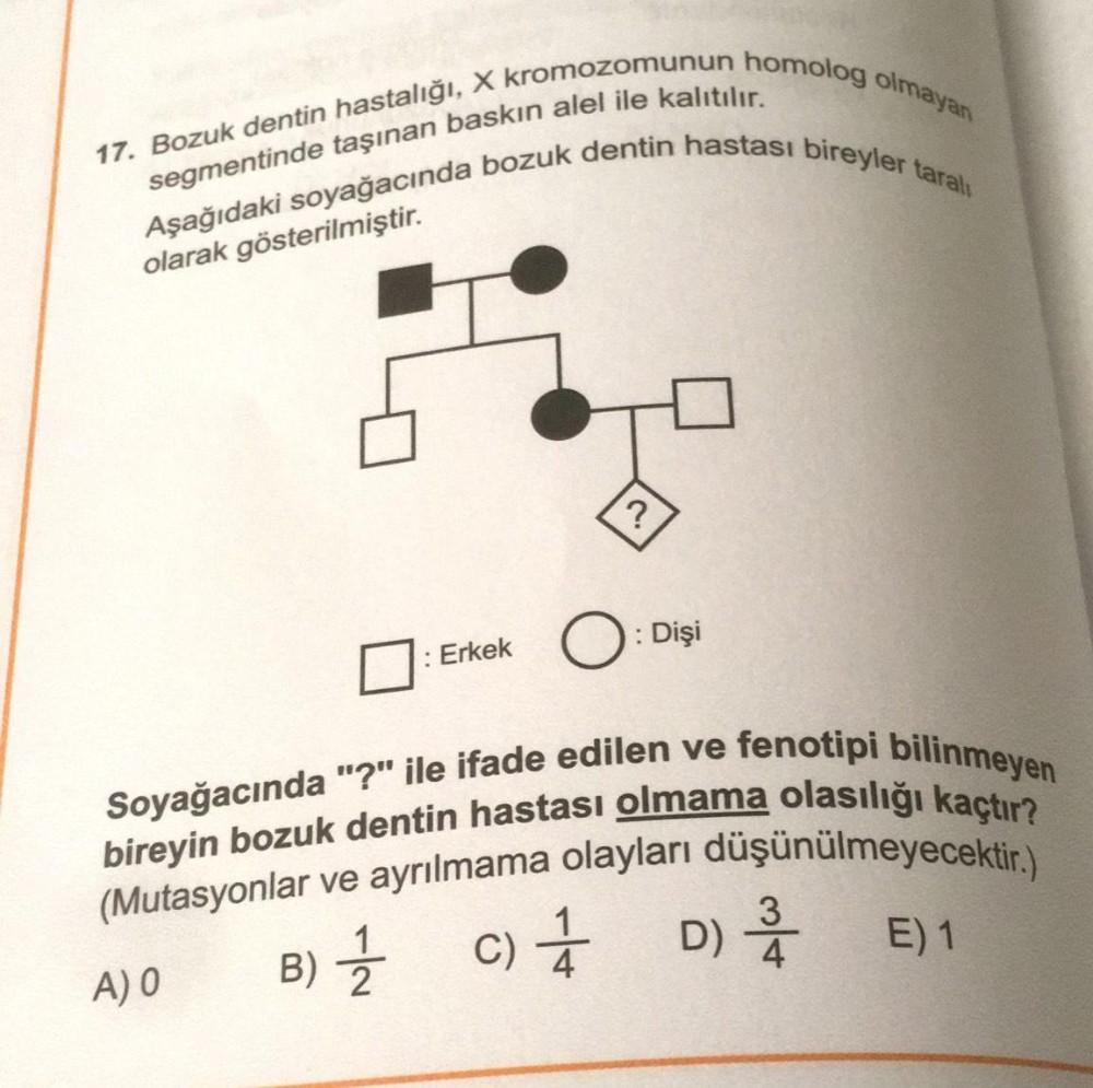 17. Bozuk dentin hastalığı, X kromozomunun homolog olmayan Aşağıdaki soyağacında bozuk dentin hastası bireyler taralı segmentinde taşınan baskın alel ile kalıtılır. olarak gösterilmiştir. : Erkek A) 0 ? O : Dişi Soyağacında "?" ile ifade edilen ve fenotipi bilinmeyen bireyin bozuk dentin hastası olmama olasılığı kaçtır? (Mutasyonlar ve ayrılmama olayları düşünülmeyecektir.) B) 1 C) 1 D) 2/1-2 E) 1