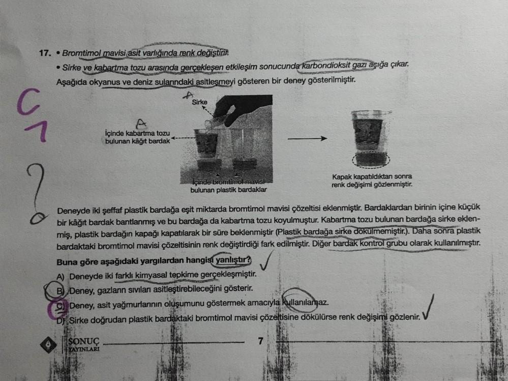 17. Bromtimol mavisi asit varlığında renk değiştiri • Sirke ve kabartma tozu arasında gerçekleşen etkileşim sonucunda karbondioksit gazı açığa çıkar. Aşağıda okyanus ve deniz sulanındaki asitleşmeyi gösteren bir deney gösterilmiştir. C İçinde kabartma tozu bulunan kâğıt bardak A Sirke SONUÇ YAYINLARI Içinde bromtimol mavisi bulunan plastik bardaklar Deneyde iki şeffaf plastik bardağa eşit miktarda bromtimol mavisi çözeltisi eklenmiştir. Bardaklardan birinin içine küçük bir kâğıt bardak bantlanmış ve bu bardağa da kabartma tozu koyulmuştur. Kabartma tozu bulunan bardağa sirke eklen- miş, plastik bardağın kapağı kapatılarak bir süre beklenmiştir (Plastik bardağa sirke dökülmemiştir.). Daha sonra plastik bardaktaki bromtimol mavisi çözeltisinin renk değiştirdiği fark edilmiştir. Diğer bardak kontrol grubu olarak kullanılmıştır. Buna göre aşağıdaki yargılardan hangisi yanlıştır? A) Deneyde iki farklı kimyasal tepkime gerçekleşmiştir. Kapak kapatıldıktan sonra renk değişimi gözlenmiştir. B Deney, gazların sıvılan asitleştirebileceğini gösterir. C) Deney, asit yağmurlarının oluşumunu göstermek amacıyla kullanılamaz. D Sirke doğrudan plastik bardaktaki bromtimol mavisi çözeltisine dökülürse renk değişimi gözlenir.