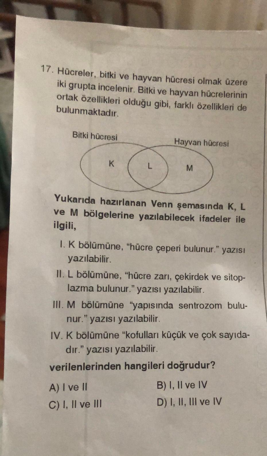 17. Hücreler, bitki ve hayvan hücresi olmak üzere iki grupta incelenir. Bitki ve hayvan hücrelerinin ortak özellikleri olduğu gibi, farklı özellikleri de bulunmaktadır. Bitki hücresi K Hayvan hücresi M Yukarıda hazırlanan Venn şemasında K, L ve M bölgelerine yazılabilecek ifadeler ile ilgili, 1. K bölümüne, "hücre çeperi bulunur." yazısı yazılabilir. II. L bölümüne, "hücre zarı, çekirdek ve sitop- lazma bulunur." yazısı yazılabilir. A) I ve II C) I, II ve III III. M bölümüne "yapısında sentrozom bulu- nur." yazısı yazılabilir. IV. K bölümüne "kofulları küçük ve çok sayıda- dır." yazısı yazılabilir. verilenlerinden hangileri doğrudur? B) I, II ve IV D) I, II, III ve IV