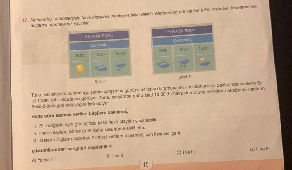 17. Meteoroloji, atmosferdeki hava olaylarını inceleyen bilim dalıdır. Meteorolog adı verilen bilim insanlar, inceleme so- nuçlarını raporlayarak yayınlar. 09.00 HAVA DURUMU Çarşamba 12.00 15.00 444 B) I ve II 09.00 15 HAVA DURUMU Çarşamba 12.00 424 Şekil-1 Şekil-2 Tuna, salı akşamı bulunduğu şehrin çarşamba gününe ait hava durumuna akıllı telefonundan baktığında verilerin Şe- kil-1'deki gibi olduğunu görüyor. Tuna, çarşamba günü saat 13.30'da hava durumuna yeniden baktığında verilerin Şekil-2'deki gibi değiştiğini fark ediyor. Buna göre sadece verilen bilgilere bakılarak, 1. Bir bölgede aynı gün içinde farklı hava olayları yaşanabilir. II. Hava olayları, iklime göre daha kısa süreli etkili olur. III. Meteorologların raporları bilimsel verilere dayandığı için kesinlik içerir. çıkarımlarından hangileri yapılabilir? A) Yalnız I 15.00 C) I ve III D) II ve III