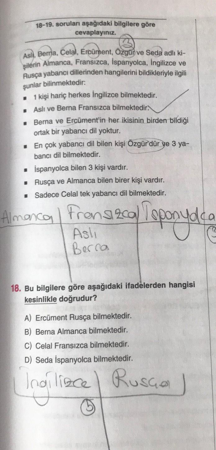 18-19. soruları aşağıdaki bilgilere göre cevaplayınız. Asli, Bema, Celal, Ercüment, Özgun ve Seda adli ki- şilerin Almanca, Fransızca, İspanyolca, İngilizce ve Rusça yabancı dillerinden hangilerini bildikleriyle ilgili şunlar bilinmektedir: 1 kişi hariç herkes İngilizce bilmektedir. Asli ve Berna Fransızca bilmektedir. • Berna ve Ercüment'in her ikisinin birden bildiği ortak bir yabancı dil yoktur. • En çok yabancı dil bilen kişi Özgürdür ye 3 ya- bancı dil bilmektedir. • İspanyolca bilen 3 kişi vardır. • Rusça ve Almanca bilen birer kişi vardır. • Sadece Celal tek yabancı dil bilmektedir. Almanca Frensizcal oponyolca Asli Berca I 18. Bu bilgilere göre aşağıdaki ifadelerden hangisi kesinlikle doğrudur? A) Ercüment Rusça bilmektedir. B) Berna Almanca bilmektedir. C) Celal Fransızca bilmektedir. D) Seda İspanyolca bilmektedir. Ingilizce Rusco)