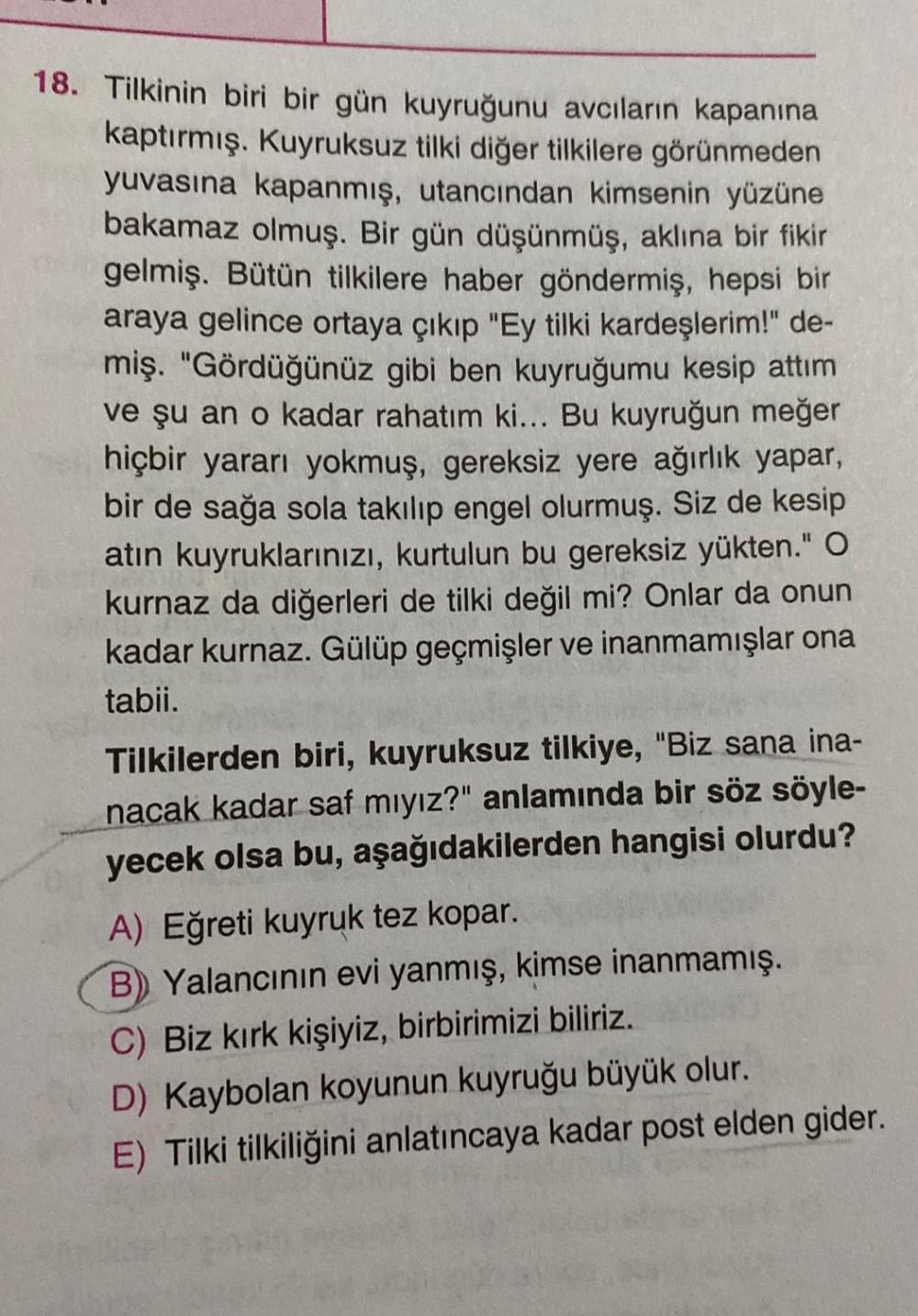 18. Tilkinin biri bir gün kuyruğunu avcıların kapanına kaptırmış. Kuyruksuz tilki diğer tilkilere görünmeden yuvasına kapanmış, utancından kimsenin yüzüne bakamaz olmuş. Bir gün düşünmüş, aklına bir fikir gelmiş. Bütün tilkilere haber göndermiş, hepsi bir araya gelince ortaya çıkıp "Ey tilki kardeşlerim!" de- miş. "Gördüğünüz gibi ben kuyruğumu kesip attım ve şu an o kadar rahatım ki... Bu kuyruğun meğer hiçbir yararı yokmuş, gereksiz yere ağırlık yapar, bir de sağa sola takılıp engel olurmuş. Siz de kesip atın kuyruklarınızı, kurtulun bu gereksiz yükten." O kurnaz da diğerleri de tilki değil mi? Onlar da onun kadar kurnaz. Gülüp geçmişler ve inanmamışlar ona tabii. Tilkilerden biri, kuyruksuz tilkiye, "Biz sana ina- nacak kadar saf mıyız?" anlamında bir söz söyle- yecek olsa bu, aşağıdakilerden hangisi olurdu? A) Eğreti kuyruk tez kopar. B) Yalancının evi yanmış, kimse inanmamış. C) Biz kırk kişiyiz, birbirimizi biliriz. D) Kaybolan koyunun kuyruğu büyük olur. E) Tilki tilkiliğini anlatıncaya kadar post elden gider.
