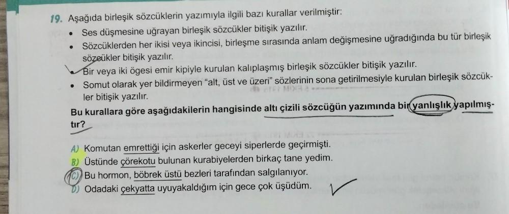 19. Aşağıda birleşik sözcüklerin yazımıyla ilgili bazı kurallar verilmiştir: • Ses düşmesine uğrayan birleşik sözcükler bitişik yazılır. Sözcüklerden her ikisi veya ikincisi, birleşme sırasında anlam değişmesine uğradığında bu tür birleşik sözeükler bitişik yazılır. Bir veya iki ögesi emir kipiyle kurulan kalıplaşmış birleşik sözcükler bitişik yazılır. Somut olarak yer bildirmeyen "alt, üst ve üzeri" sözlerinin sona getirilmesiyle kurulan birleşik sözcük- ME ler bitişik yazılır. Bu kurallara göre aşağıdakilerin hangisinde altı çizili sözcüğün yazımında bir yanlışlık yapılmış- tir? A) Komutan emrettiği için askerler geceyi siperlerde geçirmişti. B) Üstünde çörekotu bulunan kurabiyelerden birkaç tane yedim. Bu hormon, böbrek üstü bezleri tarafından salgılanıyor. Odadaki çekyatta uyuyakaldığım için gece çok üşüdüm.