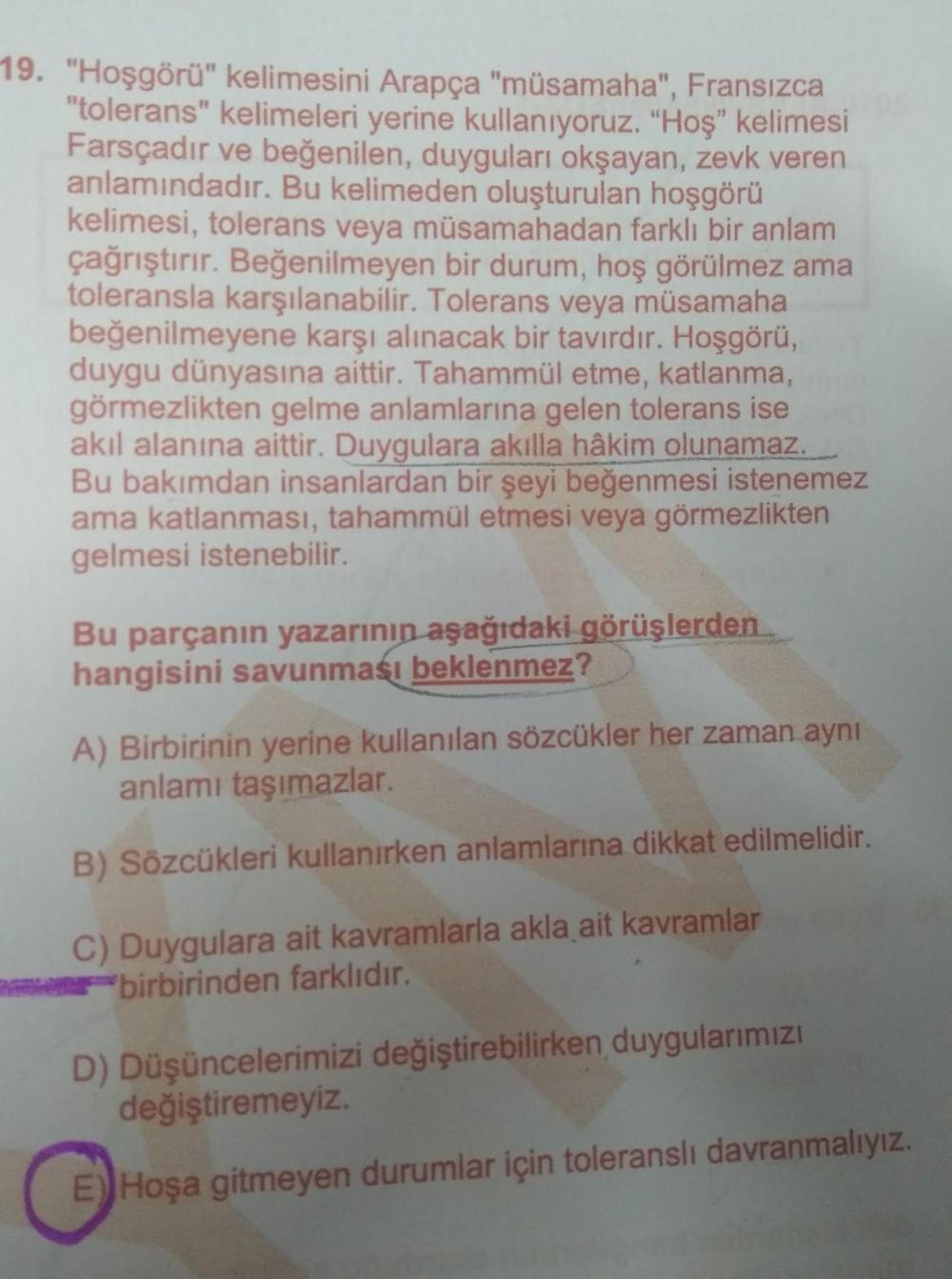 19. "Hoşgörü" kelimesini Arapça "müsamaha", Fransızca "tolerans" kelimeleri yerine kullanıyoruz. "Hoş" kelimesi Farsçadır ve beğenilen, duyguları okşayan, zevk veren anlamındadır. Bu kelimeden oluşturulan hoşgörü kelimesi, tolerans veya müsamahadan farklı bir anlam çağrıştırır. Beğenilmeyen bir durum, hoş görülmez ama toleransla karşılanabilir. Tolerans veya müsamaha beğenilmeyene karşı alınacak bir tavırdır. Hoşgörü, duygu dünyasına aittir. Tahammül etme, katlanma, görmezlikten gelme anlamlarına gelen tolerans ise akıl alanına aittir. Duygulara akılla hâkim olunamaz. Bu bakımdan insanlardan bir şeyi beğenmesi istenemez ama katlanması, tahammül etmesi veya görmezlikten gelmesi istenebilir. Bu parçanın yazarının aşağıdaki görüşlerden hangisini savunması beklenmez? A) Birbirinin yerine kullanılan sözcükler her zaman aynı anlamı taşımazlar. B) Sözcükleri kullanırken anlamlarına dikkat edilmelidir. C) Duygulara ait kavramlarla akla ait kavramlar birbirinden farklıdır. D) Düşüncelerimizi değiştirebilirken duygularımızı değiştiremeyiz. E) Hoşa gitmeyen durumlar için toleransli davranmalıyız.