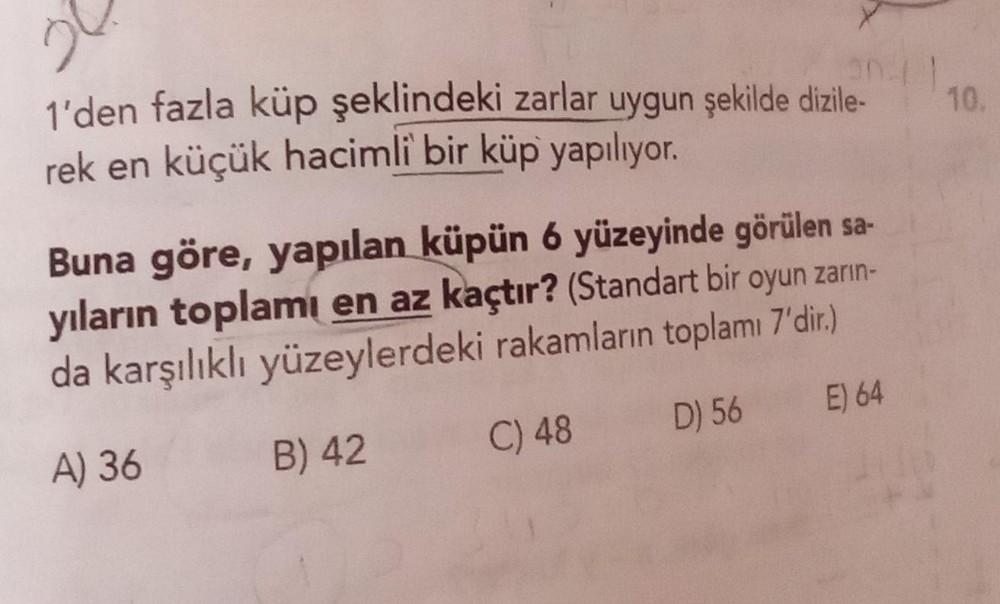 1'den fazla küp şeklindeki zarlar uygun şekilde dizile- rek en küçük hacimli bir küp yapılıyor. Buna göre, yapılan küpün 6 yüzeyinde görülen sa- yıların toplamı en az kaçtır? (Standart bir oyun zarın- da karşılıklı yüzeylerdeki rakamların toplamı 7'dir.) A) 36 B) 42 C) 48 D) 56 E) 64 10.