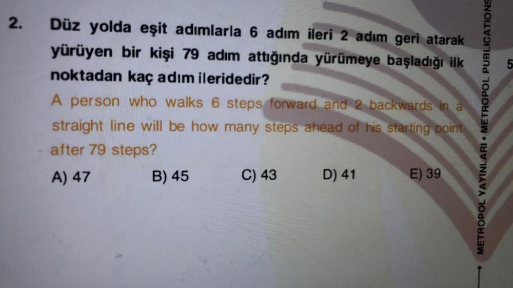 2. 5 Düz yolda eşit adımlarla 6 adım ileri 2 adım geri atarak yürüyen bir kişi 79 adım attığında yürümeye başladığı ilk noktadan kaç adım ileridedir? A person who walks 6 steps forward and 2 backwards in a straight line will be how many steps ahead of his starting point after 79 steps? A) 47 B) 45 D) 41 E) 39 METROPOL YAYINLARI - METROPOL PUBLICATIONS C) 43