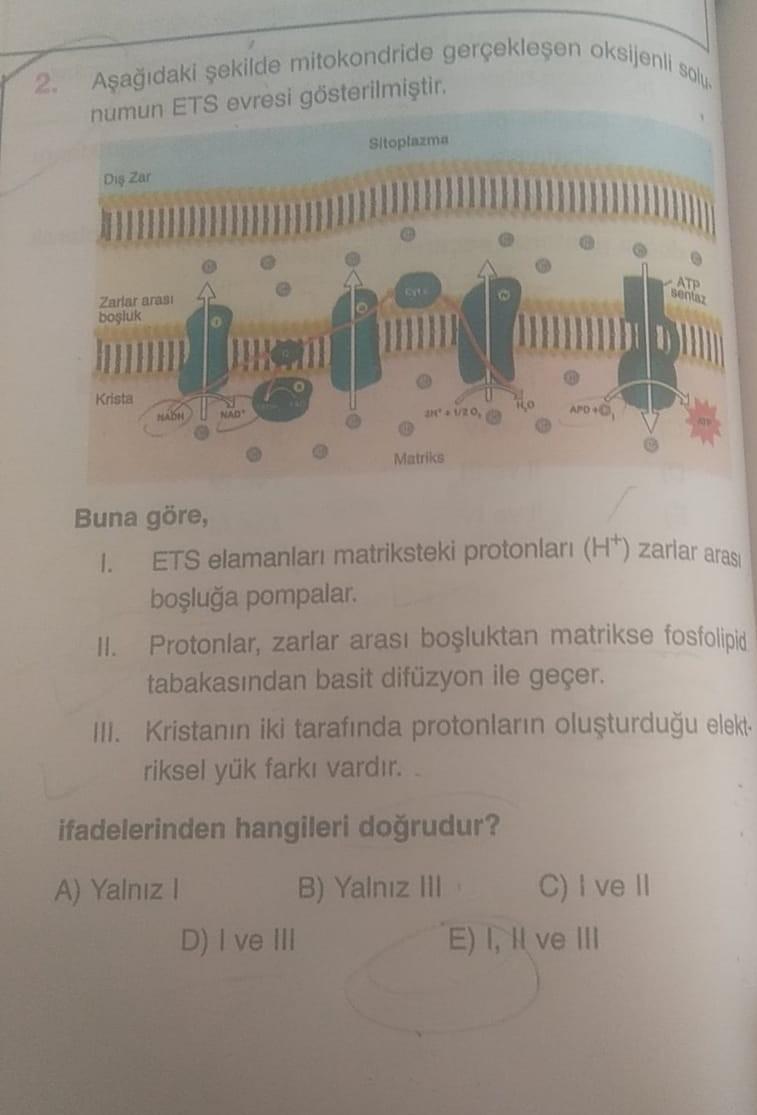 2. Aşağıdaki şekilde mitokondride gerçekleşen oksijenli olur. numun ETS evresi gösterilmiştir. Sitoplazma Diş Zal ATP sentaz Zarlar arası boşluk Krista MADH NAD 120, APDO, Matriks Buna göre, 1. ETS elamanları matriksteki protonları (H) zarlar arası boşluğa pompalar II. Protonlar, zarlar arası boşluktan matrikse fosfolipid tabakasından basit difüzyon ile geçer. III. Kristanın iki tarafında protonların oluşturduğu elekt: riksel yük farkı vardır. ifadelerinden hangileri doğrudur? A) Yalnız ! B) Yalnız III C) I ve II D) I ve III E) I, II ve II