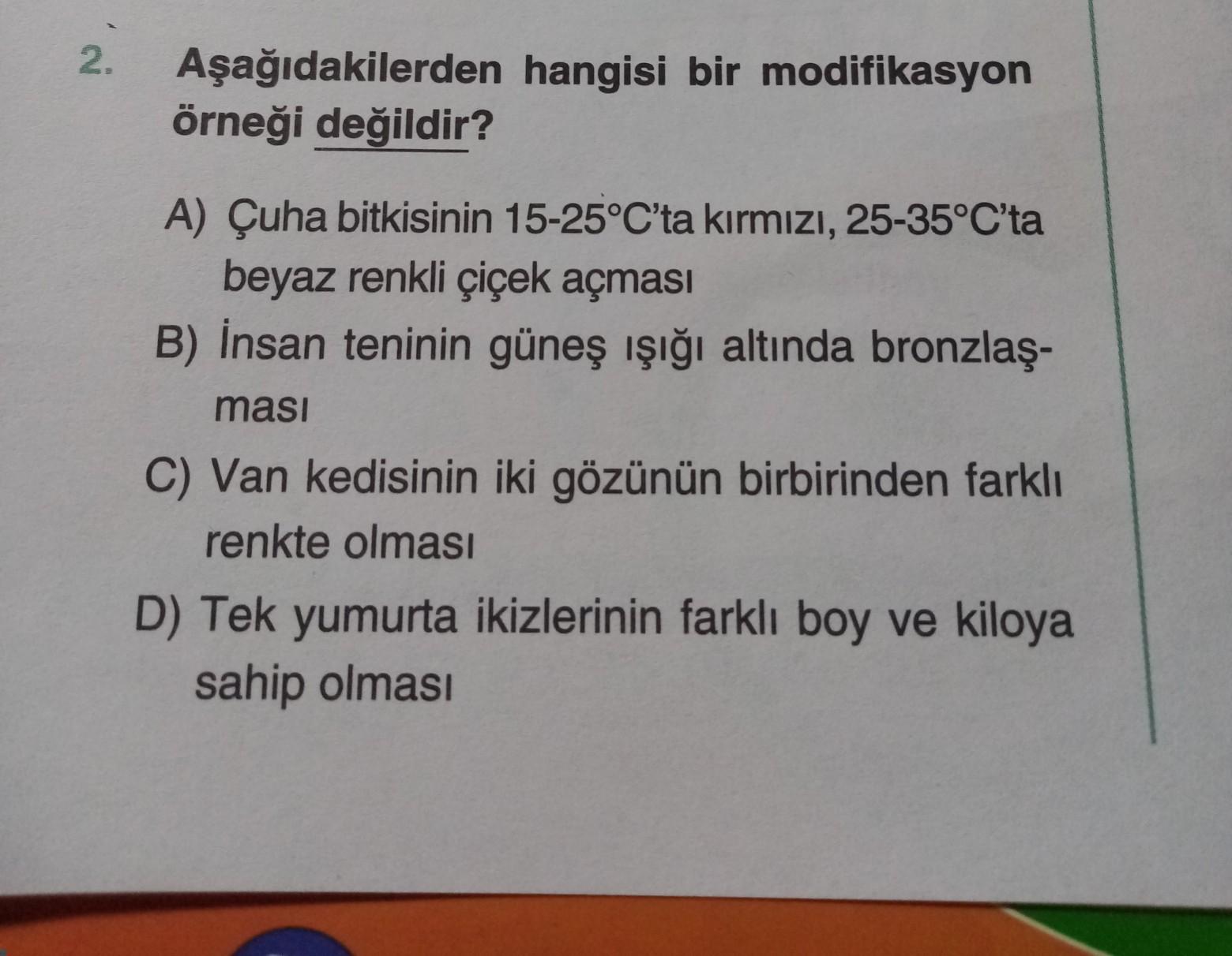 2. Aşağıdakilerden hangisi bir modifikasyon örneği değildir? A) Çuha bitkisinin 15-25°C'ta kırmızı, 25-35°C'ta beyaz renkli çiçek açması B) İnsan teninin güneş ışığı altında bronzlaş- ması C) Van kedisinin iki gözünün birbirinden farklı renkte olması D) Tek yumurta ikizlerinin farklı boy ve kiloya sahip olması