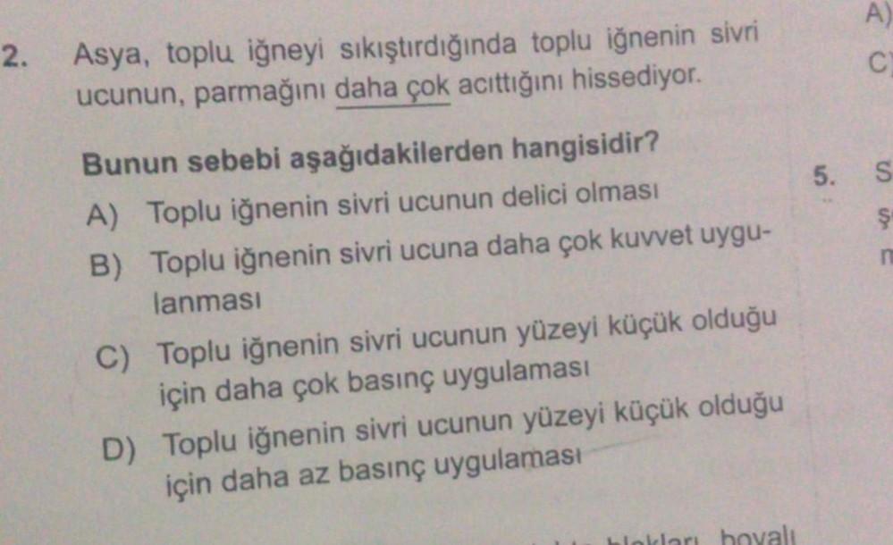 2. Asya, toplu iğneyi sıkıştırdığında toplu iğnenin sivri ucunun, parmağını daha çok acıttığını hissediyor. Bunun sebebi aşağıdakilerden hangisidir? A) Toplu iğnenin sivri ucunun delici olması B) Toplu iğnenin sivri ucuna daha çok kuvvet uygu- lanması C) Toplu iğnenin sivri ucunun yüzeyi küçük olduğu için daha çok basınç uygulaması D) Toplu iğnenin sivri ucunun yüzeyi küçük olduğu için daha az basınç uygulaması blokları boyalı A) C 5. S Ş