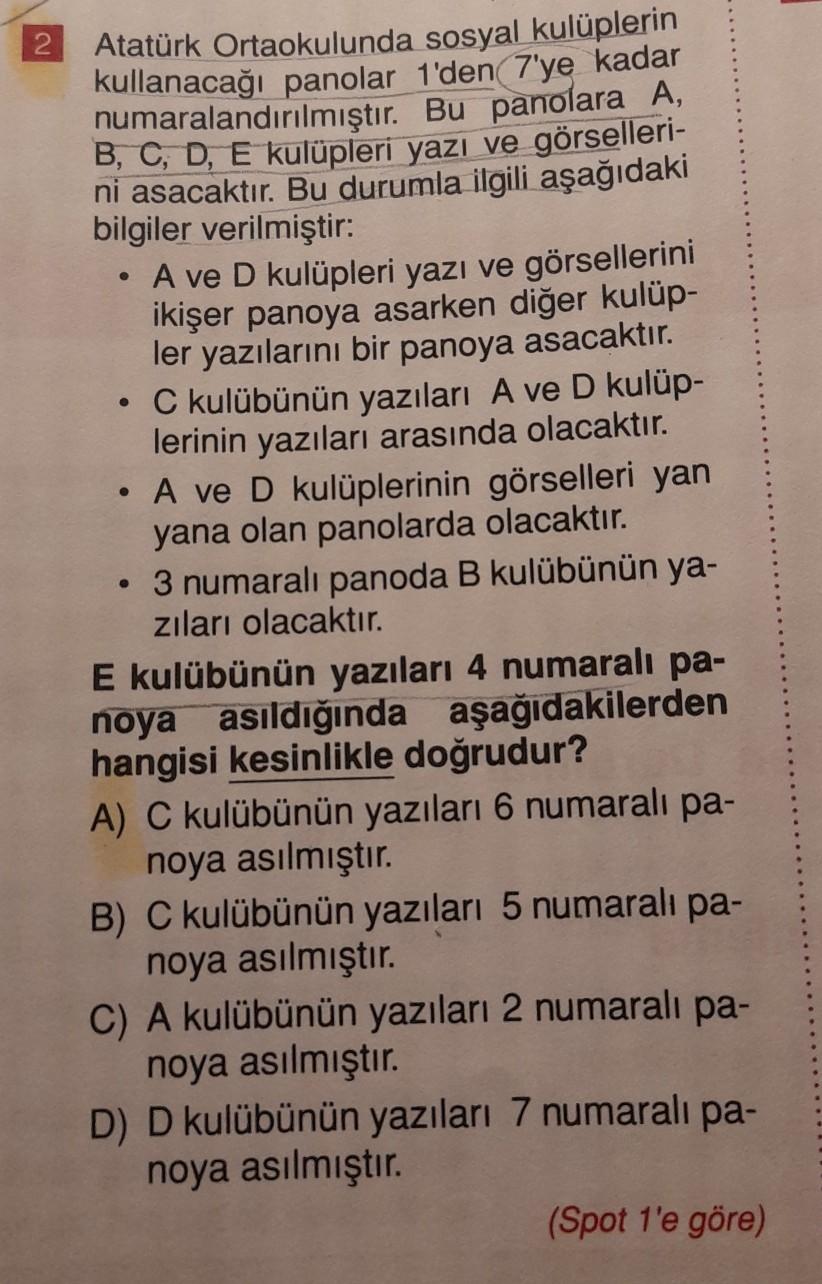2 Atatürk Ortaokulunda sosyal kulüplerin kullanacağı panolar 1'den 7'ye kadar numaralandırılmıştır. Bu panolara A, B, C, D, E kulüpleri yazı ve görselleri- ni asacaktır. Bu durumla ilgili aşağıdaki bilgiler verilmiştir: A ve D kulüpleri yazı ve görsellerini ikişer panoya asarken diğer kulüp- ler yazılarını bir panoya asacaktır. • C kulübünün yazıları A ve D kulüp- lerinin yazıları arasında olacaktır. . A ve D kulüplerinin görselleri yan yana olan panolarda olacaktır. 3 numaralı panoda B kulübünün ya- zıları olacaktır. E kulübünün yazıları 4 numaralı pa- noya asıldığında aşağıdakilerden hangisi kesinlikle doğrudur? A) C kulübünün yazıları 6 numaralı pa- noya asılmıştır. B) C kulübünün yazıları 5 numaralı pa- noya asılmıştır. C) A kulübünün yazıları 2 numaralı pa- noya asılmıştır . D D kulübünün yazıları 7 numaralı pa- noya asılmıştır. (Spot 1'e göre)