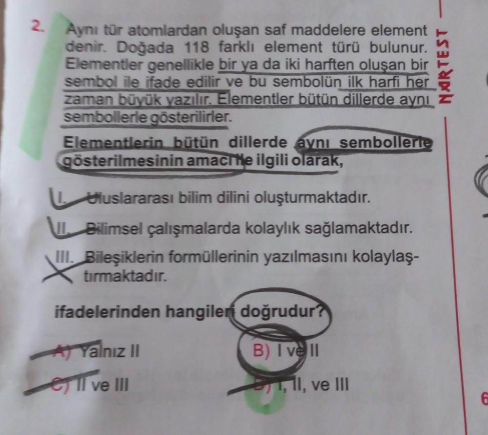 2. Aynı tür atomlardan oluşan saf maddelere element denir. Doğada 118 farklı element türü bulunur. Elementler genellikle bir ya da iki harften oluşan bir sembol ile ifade edilir ve bu sembolün ilk harfi her zaman büyük yazılır. Elementler bütün dillerde aynı sembollerle gösterilirler. Elementlerin bütün dillerde aynı sembollerte gösterilmesinin amacı ne ilgili olarak, Uluslararası bilim dilini oluşturmaktadır. II Bilimsel çalışmalarda kolaylık sağlamaktadır. III. Bileşiklerin formüllerinin yazılmasını kolaylaş- tırmaktadır. ifadelerinden hangiler doğrudur? A Yalnız II B) I vell II ve III 5, 1, 11, ve III NORTEST 6