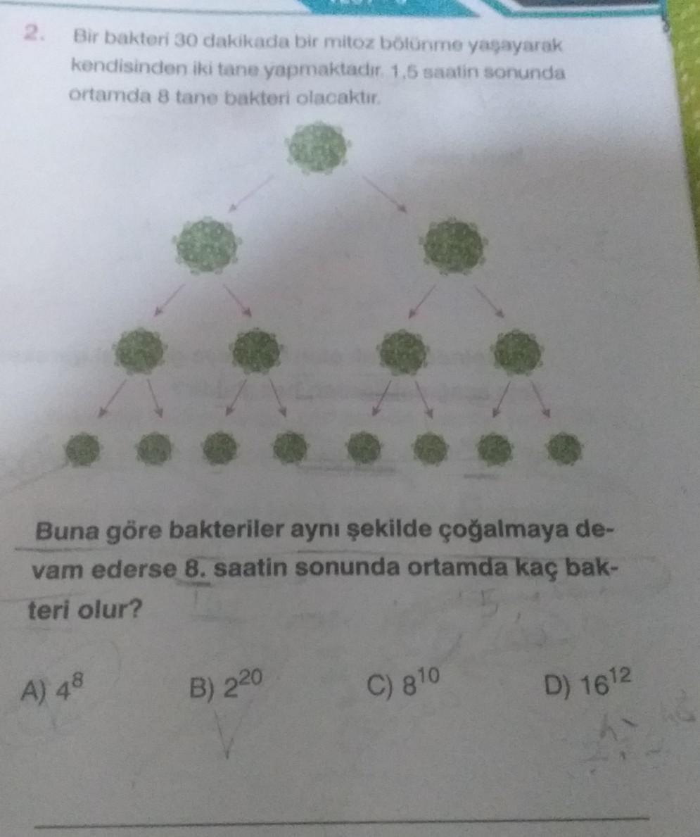2. Bir bakteri 30 dakikada bir mitoz bölünme yaşayarak kendisinden iki tane yapmaktadır. 1,5 saatin sonunda ortamda 8 tane bakteri olacaktır. Buna göre bakteriler aynı şekilde çoğalmaya de- vam ederse 8. saatin sonunda ortamda kaç bak- teri olur? A) 48 B) 220 C) 810 D) 1612