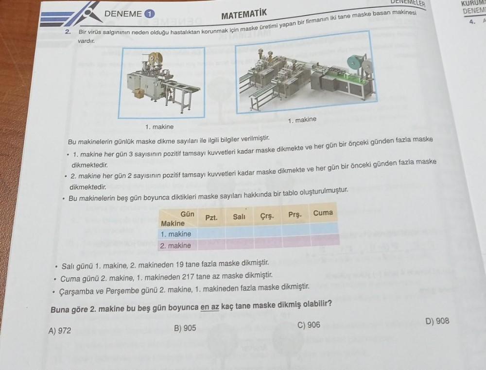 2. . DENEME 1 MATEMATİK Bir virüs salgınının neden olduğu hastalıktan korunmak için maske üretimi yapan bir firmanın iki tane maske basan makinesi AM vardır. 1. makine Bu makinelerin günlük maske dikme sayıları ile ilgili bilgiler verilmiştir. • 1. makine her gün 3 sayısının pozitif tamsayı kuvvetleri kadar maske dikmekte ve her gün bir önceki günden fazla maske dikmektedir. 1. makine • 2. makine her gün 2 sayısının pozitif tamsayı kuvvetleri kadar maske dikmekte ve her gün bir önceki günden fazla maske dikmektedir. • Bu makinelerin beş gün boyunca diktikleri maske sayıları hakkında bir tablo oluşturulmuştur. Gün Makine 1. makine 2. makine Pzt. Salı Cuma Prş. Çrş. • Salı günü 1. makine, 2. makineden 19 tane fazla maske dikmiştir. • Cuma günü 2. makine, 1. makineden 217 tane az maske dikmiştir. Çarşamba ve Perşembe günü 2. makine, 1. makineden fazla maske dikmiştir. Buna göre 2. makine bu beş gün boyunca en az kaç tane maske dikmiş olabilir? A) 972 B) 905 C) 906 D) 908 KURUMS DENEM 4.