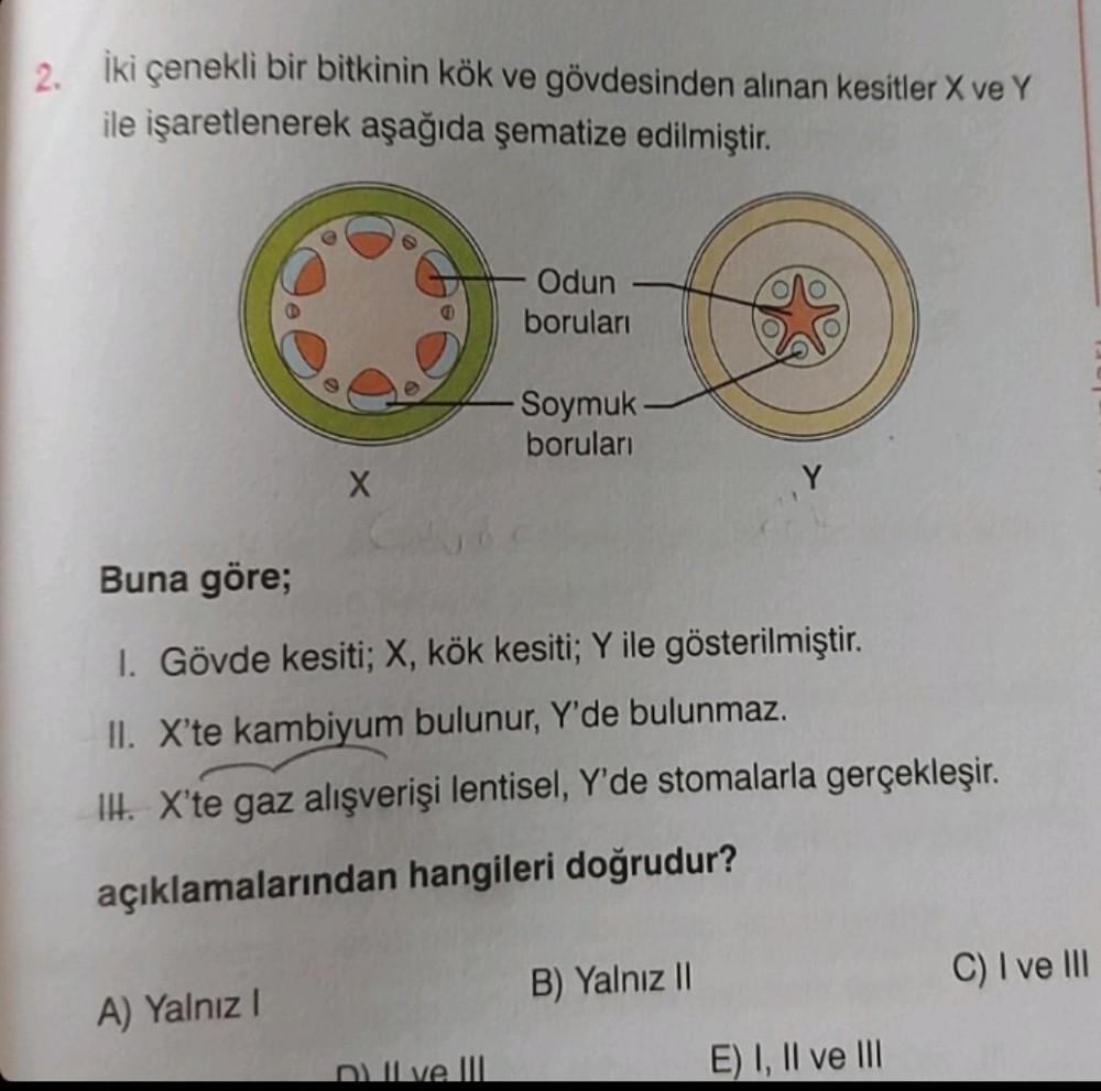 2. İki çenekli bir bitkinin kök ve gövdesinden alınan kesitler X ve Y ile işaretlenerek aşağıda şematize edilmiştir. X A) Yalnız I Odun boruları Buna göre; 1. Gövde kesiti; X, kök kesiti; Y ile gösterilmiştir. II. X'te kambiyum bulunur, Y'de bulunmaz. III. X'te gaz alışverişi lentisel, Y'de stomalarla gerçekleşir. açıklamalarından hangileri doğrudur? D) II ve III Soymuk- boruları B) Yalnız II E) I, II ve III C) I ve III