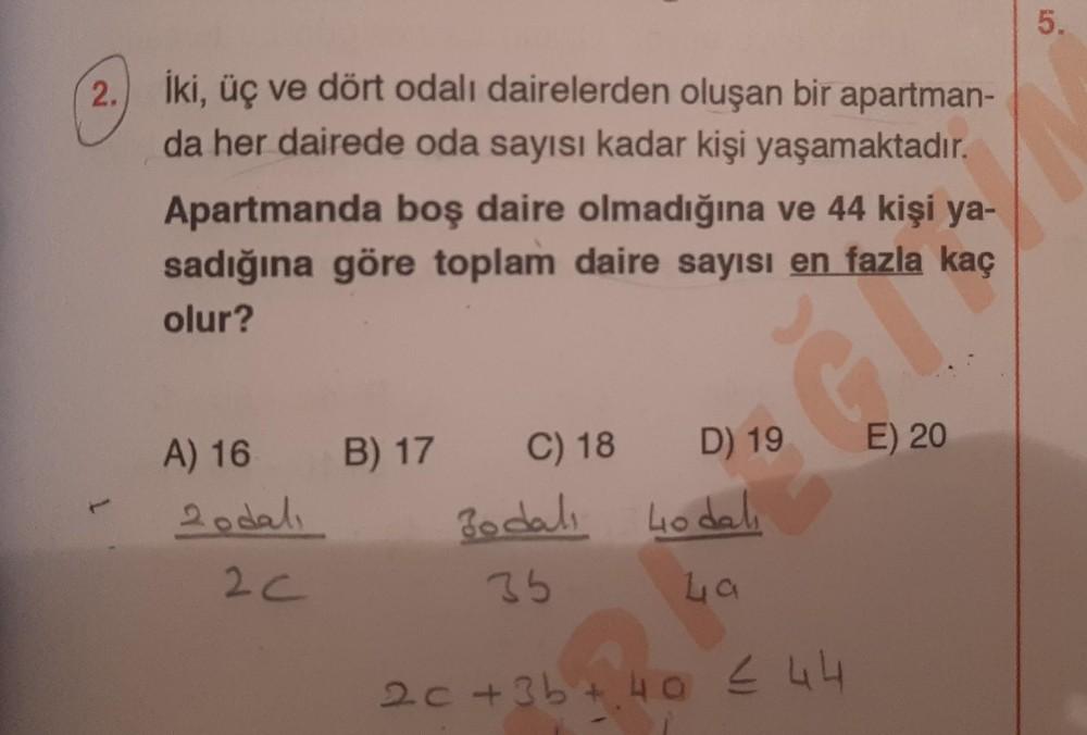 2. İki, üç ve dört odalı dairelerden oluşan bir apartman- da her dairede oda sayısı kadar kişi yaşamaktadır. Apartmanda boş daire olmadığına ve 44 kişi ya- sadığına göre toplam daire sayısı en fazla kaç olur? T A) 16 2 odalı 2 C B) 17 C) 18 D) 19 Jodalı 40 dali 35 La 2c +3b+ 40 ≤ 44 5.40 E) 20 5.
