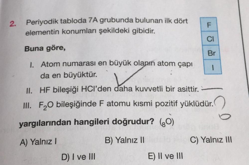 2. Periyodik tabloda 7A grubunda bulunan ilk dört F. elementin konumları şekildeki gibidir. CI Buna göre, Br 1. Atom numarası en büyük olanın atom çapı 1 da en büyüktür. II. HF bileşiği HCl'den daha kuvvetli bir asittir. III. F,O bileşiğinde F atomu kismi pozitif yüklüdür. yargılarından hangileri doğrudur? (30) A) Yalnız! B) Yalnız II C) Yalnız III D) I ve III E) II ve III