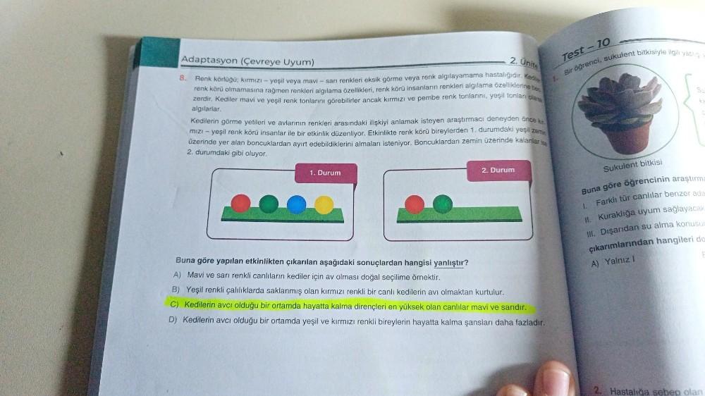 2. Ünite Adaptasyon (Çevreye Uyum) Renk Körlüğü; kırmızı-yeşil veya mavi - sarı renkleri eksik görme veya renk algılayamama hastalığıdır. Ked renk körü olmamasına rağmen renkleri algılama özellikleri, renk körü insanların renkleri algılama özelliklerine be zerdir. Kediler mavi ve yeşil renk tonlarını görebilirler ancak kırmızı ve pembe renk tonlarını, yeşil tonlanı olarak 8. algılarlar. Kedilerin görme yetileri ve avlarının renkleri arasındaki ilişkiyi anlamak isteyen araştırmacı deneyden önce k mızı-yeşil renk körü insanlar ile bir etkinlik düzenliyor. Etkinlikte renk körü bireylerden 1. durumdaki yeşil zemin üzerinde yer alan boncuklardan ayırt edebildiklerini almaları isteniyor. Boncuklardan zemin üzerinde kalanlar ise 2. durumdaki gibi oluyor. 1. Durum 2. Durum Buna göre yapılan etkinlikten çıkarılan aşağıdaki sonuçlardan hangisi yanlıştır? A) Mavi ve sarı renkli canlıların kediler için av olması doğal seçilime örnektir. B) Yeşil renkli çalılıklarda saklanmış olan kırmızı renkli bir canlı kedilerin avı olmaktan kurtulur. C) Kedilerin avcı olduğu bir ortamda hayatta kalma dirençleri en yüksek olan canlılar mavi ve sarıdır. D) Kedilerin avcı olduğu bir ortamda yeşil ve kırmızı renkli bireylerin hayatta kalma şansları daha fazladır. 10 Test- 1. Bir öğrenci, sukulent bitkisiyle ilgili yaptigi Sukulent bitkisi Buna göre öğrencinin araştırma Farklı tür canlılar benzer ada 1. II. Kuraklığa uyum sağlayacak III. Dışarıdan su alma konusun çıkarımlarından hangileri da A) Yalnız I 2. Hastalığa sebep olan