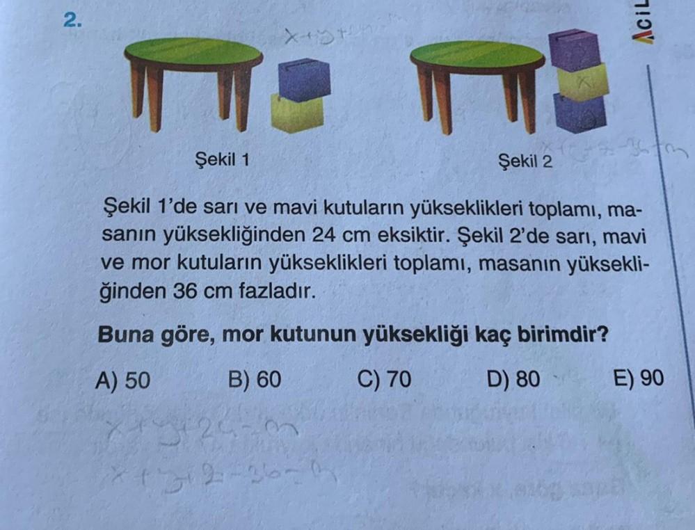 2. x+y+ Şekil 2 Şekil 1 Şekil 1'de sarı ve mavi kutuların yükseklikleri toplamı, ma- sanın yüksekliğinden 24 cm eksiktir. Şekil