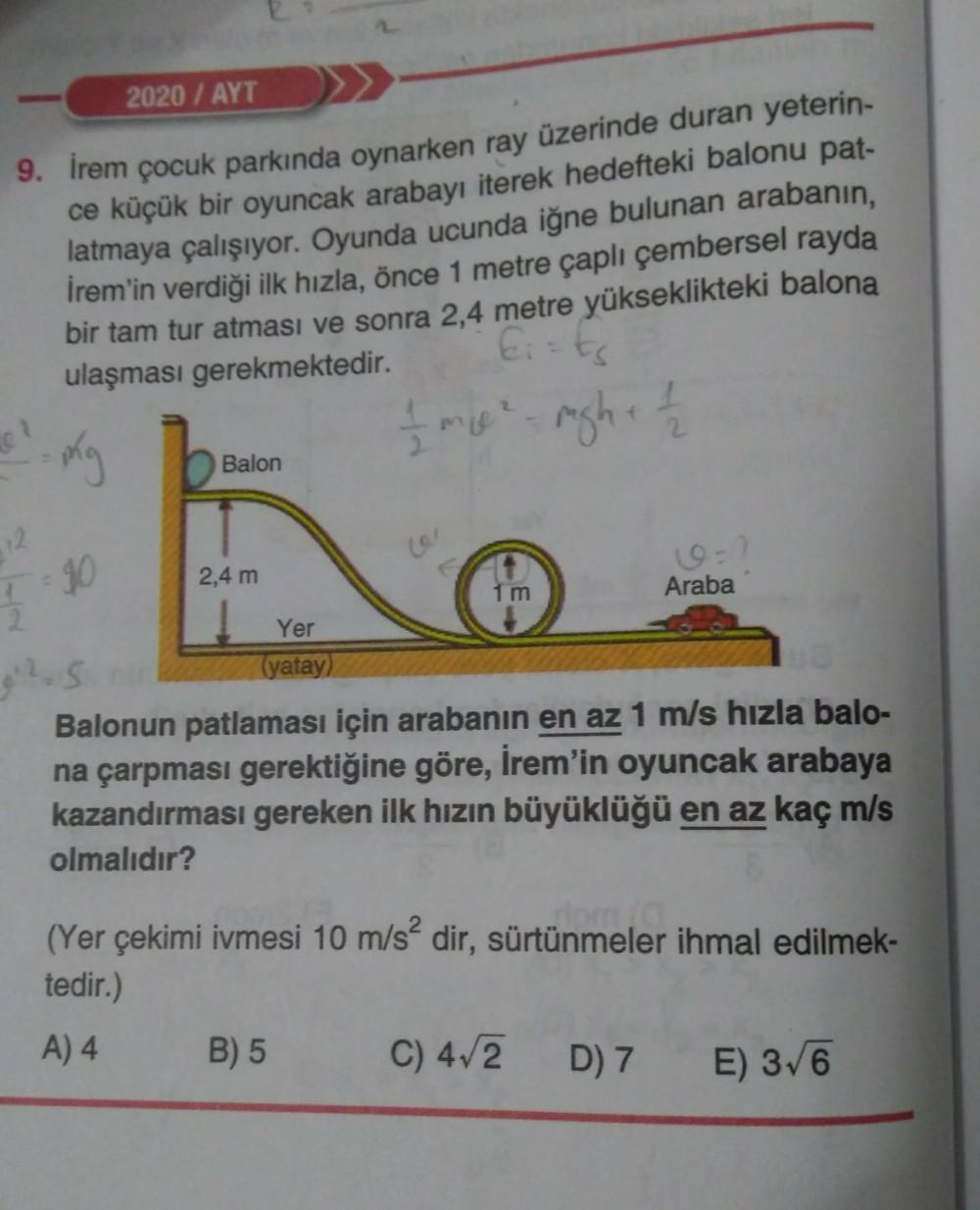 2020 / AYT 9. Irem çocuk parkında oynarken ray üzerinde duran yeterin- ce küçük bir oyuncak arabayı iterek hedefteki balonu pat- latmaya çalışıyor. Oyunda ucunda iğne bulunan arabanın, İrem'in verdiği ilk hızla, önce 1 metre çaplı çembersel rayda bir tam tur atması ve sonra 2,4 metre yükseklikteki balona ulaşması gerekmektedir. I mee-righ + 1 - 2 Ei= Es e - kg Balon 12 co 90 2,4 m 1 m Araba Yer 2.5 (yatay) Balonun patlaması için arabanın en az 1 m/s hızla balo- na çarpması gerektiğine göre, İrem'in oyuncak arabaya kazandırması gereken ilk hızın büyüklüğü en az kaç m/s olmalıdır? (Yer çekimi ivmesi 10 m/s² dir, sürtünmeler ihmal edilmek- tedir.) A) 4 B) 5 C) 4,2 D) 7 E) 316