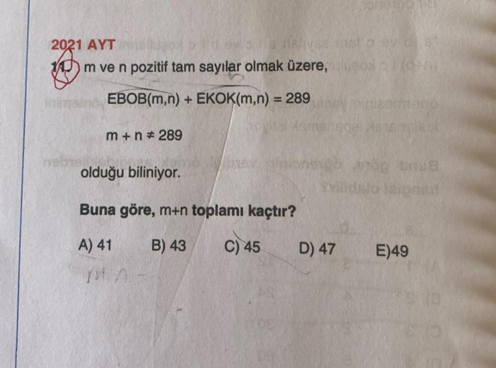 2021 AYT m ve n pozitif tam sayılar olmak üzere, inimsin EBOB(m,n) + EKOK(m,n) = 289 m+n# 289 olduğu biliniyor. Buna göre, m+n toplamı kaçtır? A) 41 B) 43 C) 45 MA- D) 47 vost (dis mipermano 1700 unve sipnsif st E)49
