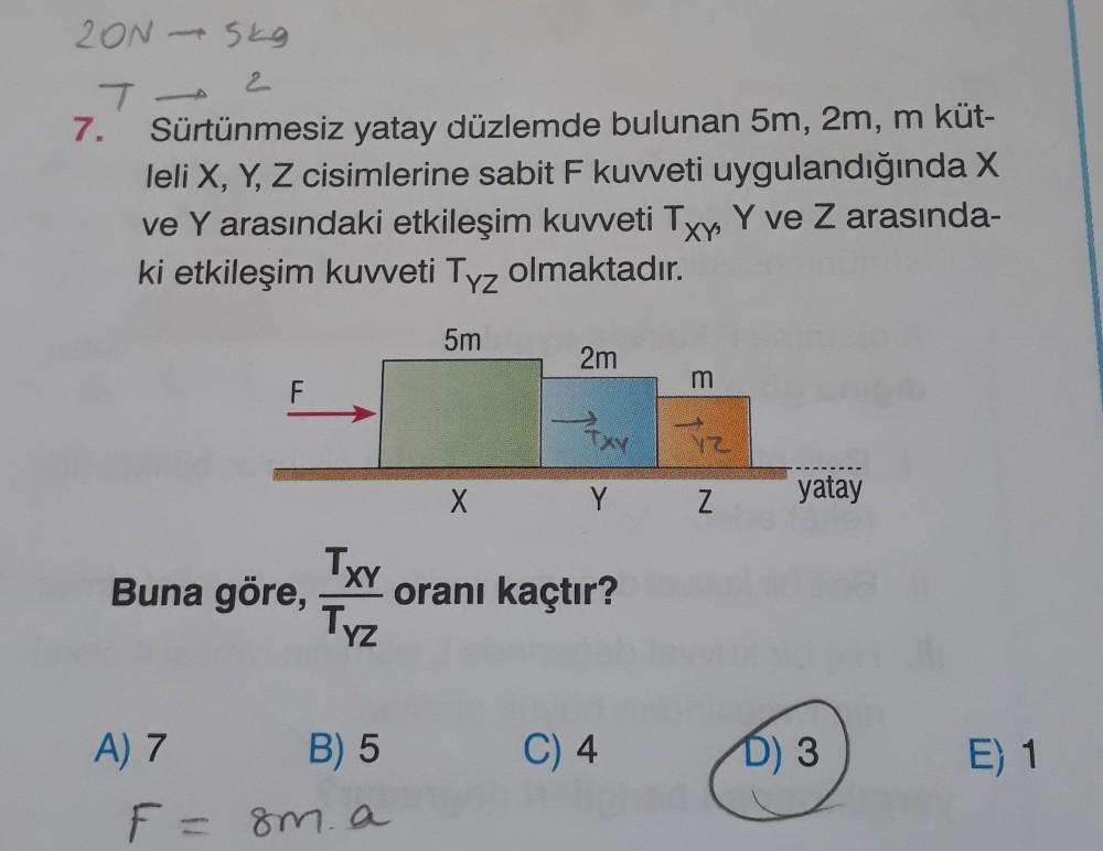 20N-5kg 7-2 T 7. Sürtünmesiz yatay düzlemde bulunan 5m, 2m, m küt- leli X, Y, Z cisimlerine sabit F kuvveti uygulandığında X ve Y arasındaki etkileşim kuvveti Txy, Y ve Z arasında- ki etkileşim kuvveti Tyz olmaktadır. XY' YZ 5m F Buna göre, A) 7 TxY Tyz B) 5 F = 8m. a X 2m m Fxy Tz Y Z oranı kaçtır? C) 4 yatay D) 3 E) 1