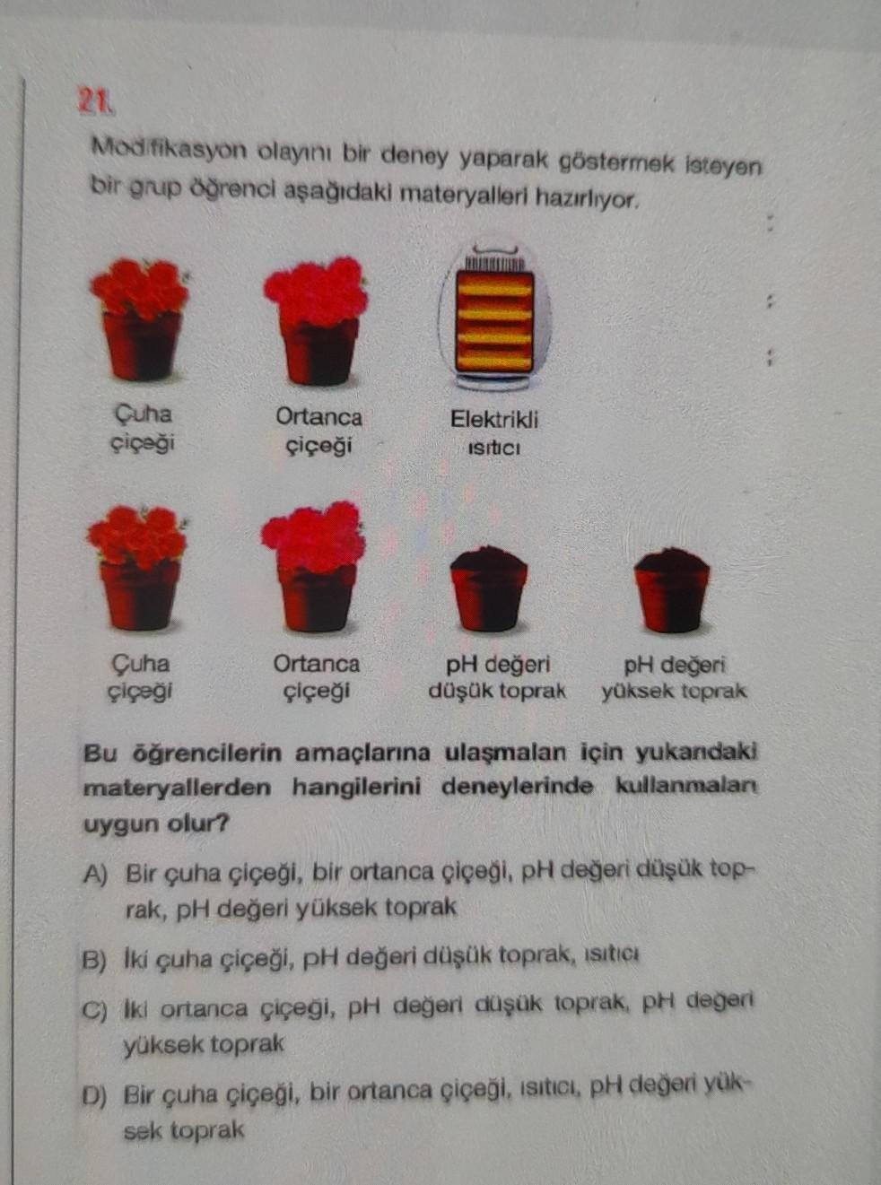 21 Modifikasyon olayını bir deney yaparak göstermek isteyen bir grup öğrenci aşağıdaki materyalleri hazırlıyor. Çuha çiçeği Çuha çiçeği Ortanca çiçeği Ortanca çiçeği Elektrikli ISITICI pH değeri düşük toprak pH değeri yüksek toprak Bu öğrencilerin amaçlarına ulaşmalan için yukandaki materyallerden hangilerini deneylerinde kullanmalar uygun olur? A) Bir çuha çiçeği, bir ortanca çiçeği, pH değeri düşük top- rak, pH değeri yüksek toprak B) İki çuha çiçeği, pH değeri düşük toprak, ısıtıcı C) Iki ortanca çiçeği, pH değeri düşük toprak, pH değeri yüksek toprak D) Bir çuha çiçeği, bir ortanca çiçeği, ısıtıcı, pH değeri yük- sek toprak