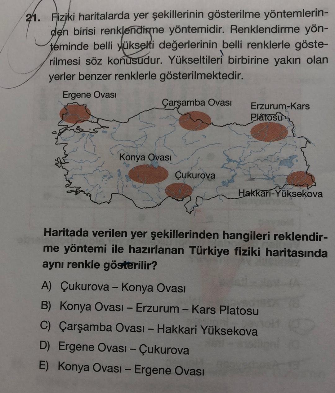 21. Riziki haritalarda yer şekillerinin gösterilme yöntemlerin- den birisi renklendirme yöntemidir. Renklendirme yön- teminde belli Yükselti değerlerinin belli renklerle göste- rilmesi söz konusudur. Yükseltileri birbirine yakın olan yerler benzer renklerle gösterilmektedir. Ergene Ovası Çarşamba Ovası Erzurum-Kars Plåtosu Konya Ovasi Çukurova Hakkari-Yüksekova Haritada verilen yer şekillerinden hangileri reklendir- me yöntemi ile hazırlanan Türkiye fiziki haritasında aynı renkle gösterilir? A) Çukurova - Konya Ovası B) Konya Ovası - Erzurum - Kars Platosu C) Çarşamba Ovası - Hakkari Yüksekova D) Ergene Ovası - Çukurova E) Konya Ovası - Ergene Ovası