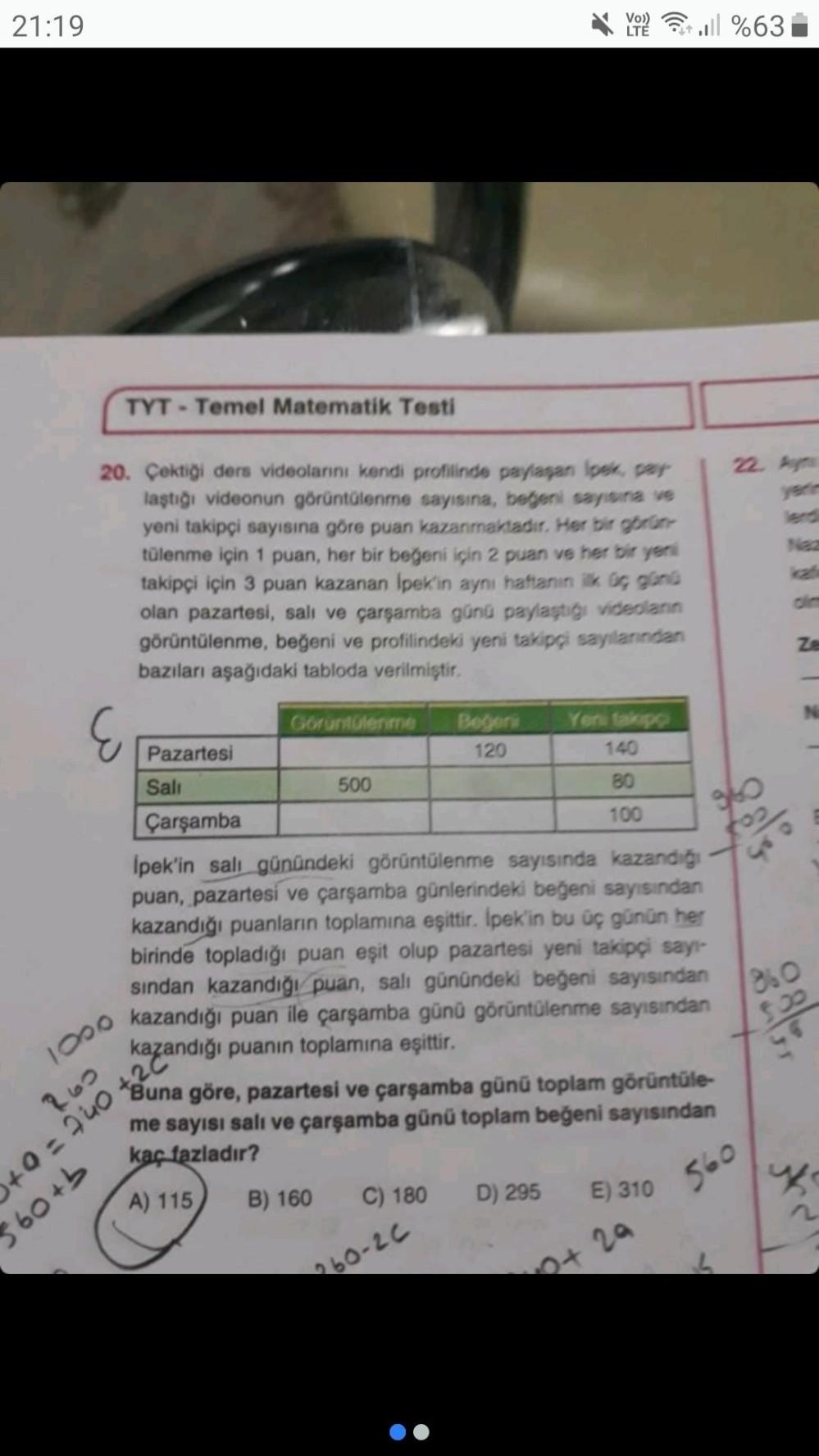 21:19 1000 20. Çektiği ders videolarını kendi profilinde paylaşan Ipek, pay laştığı videonun görüntülenme sayısına, beğeni sayısına ve yeni takipçi sayısına göre puan kazanmaktadır. Her bir görün tülenme için 1 puan, her bir beğeni için 2 puan ve her bir yeni takipçi için 3 puan kazanan Ipek'in ayni haftanın ilk üç günü olan pazartesi, salı ve çarşamba günü paylaştığı videoların görüntülenme, beğeni ve profilindeki yeni takipçi sayılanından bazıları aşağıdaki tabloda verilmiştir. E TYT Temel Matematik Testi 260 +9=240 $60+b Pazartesi Sali Çarşamba Görüntülenme Beğeni 120 500 B) 160 İpek'in salı günündeki görüntülenme sayısında kazandığı puan, pazartesi ve çarşamba günlerindeki beğeni sayısından kazandığı puanların toplamına eşittir. İpek'in bu üç günün her birinde topladığı puan eşit olup pazartesi yeni takipçi sayı- sından kazandığı puan, salı günündeki beğeni sayısından kazandığı puan ile çarşamba günü görüntülenme sayısından kazandığı puanın toplamına eşittir. Vol %631 LTÉ *Buna göre, pazartesi ve çarşamba günü toplam görüntüle- me sayısı salı ve çarşamba günü toplam beğeni sayısından kaç fazladır? A) 115 560 C) 180 260-20 Yeni takipo 140 80 100 D) 295 E) 310 2+ 29 22. Ayn 960 Ze 860 500 t