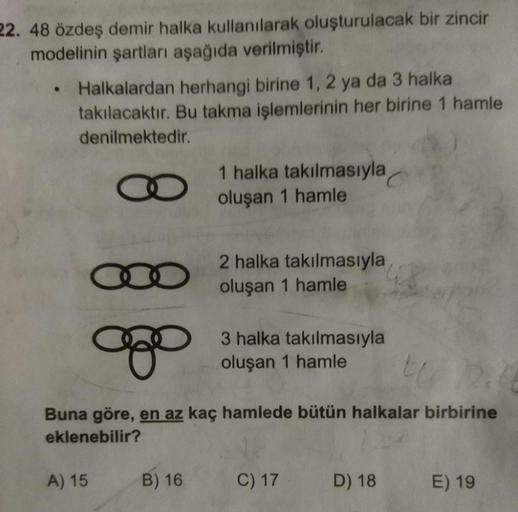 22. 48 özdeş demir halka kullanılarak oluşturulacak bir zincir modelinin şartları aşağıda verilmiştir. • Halkalardan herhangi birine 1, 2 ya da 3 halka takılacaktır. Bu takma işlemlerinin her birine 1 hamle denilmektedir. A) 15 1 halka takılmasıyla oluşan 1 hamle ∞ go t 12.06 Buna göre, en az kaç hamlede bütün halkalar birbirine eklenebilir? B) 16 2 halka takılmasıyla oluşan 1 hamle 3 halka takılmasıyla oluşan 1 hamle C) 17 D) 18 E) 19