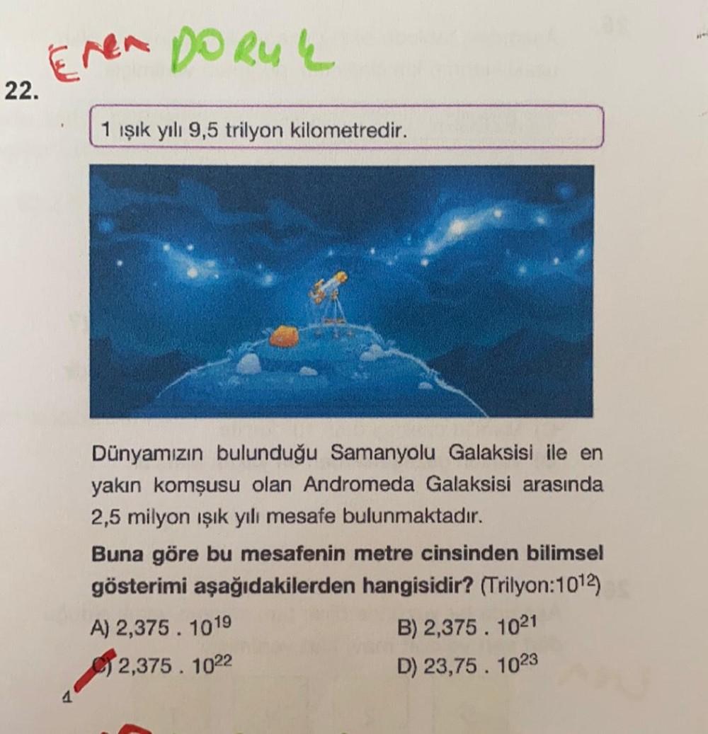 22. Eren DORUL 1 ışık yılı 9,5 trilyon kilometredir. Dünyamızın bulunduğu Samanyolu Galaksisi ile en yakın komşusu olan Andromeda Galaksisi arasında 2,5 milyon ışık yılı mesafe bulunmaktadır. Buna göre bu mesafenin metre cinsinden bilimsel gösterimi aşağıdakilerden hangisidir? (Trilyon:1012) A) 2,375. 1019 2,375.1022 B) 2,375.1021 D) 23,75. 1023 21