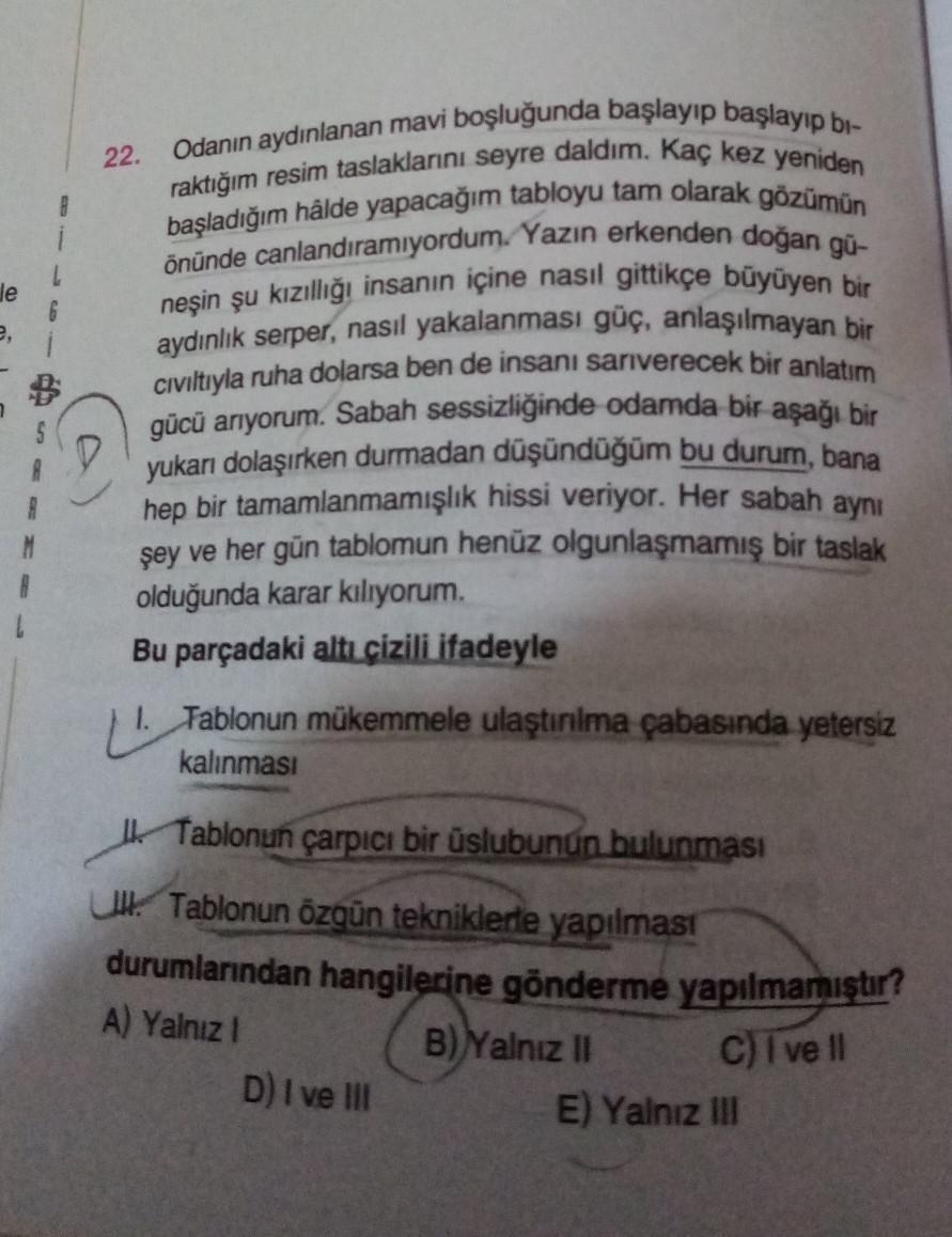 22. Je Odanın aydınlanan mavi boşluğunda başlayıp başlayıp bi- raktığım resim taslaklarını seyre daldım. Kaç kez yeniden başladığım hâlde yapacağım tabloyu tam olarak gözümün önünde canlandıramıyordum. Yazın erkenden doğan gü- neşin şu kızıllığı insanın içine nasıl gittikçe büyüyen bir aydınlık serper, nasıl yakalanması güç, anlaşılmayan bir civiltıyla ruha dolarsa ben de insanı sarıverecek bir anlatım gücü arıyorum. Sabah sessizliğinde odamda bir aşağı bir yukarı dolaşırken durmadan düşündüğüm bu durum, bana hep bir tamamlanmamışlık hissi veriyor. Her sabah aynı şey ve her gün tablomun henüz olgunlaşmamış bir taslak olduğunda karar kılıyorum. Bu parçadaki altı çizili ifadeyle Tablonun mükemmele ulaştınıma çabasında yetersiz kalınması 1 Tablonun çarpıcı bir üslubunun bulunması Ul. Tablonun özgün tekniklerle yapılması durumlarından hangilerine gönderme yapılmamıştır? A) Yalnız! B) Yalnız II D) I ve III E) Yalnız III C) Tvell