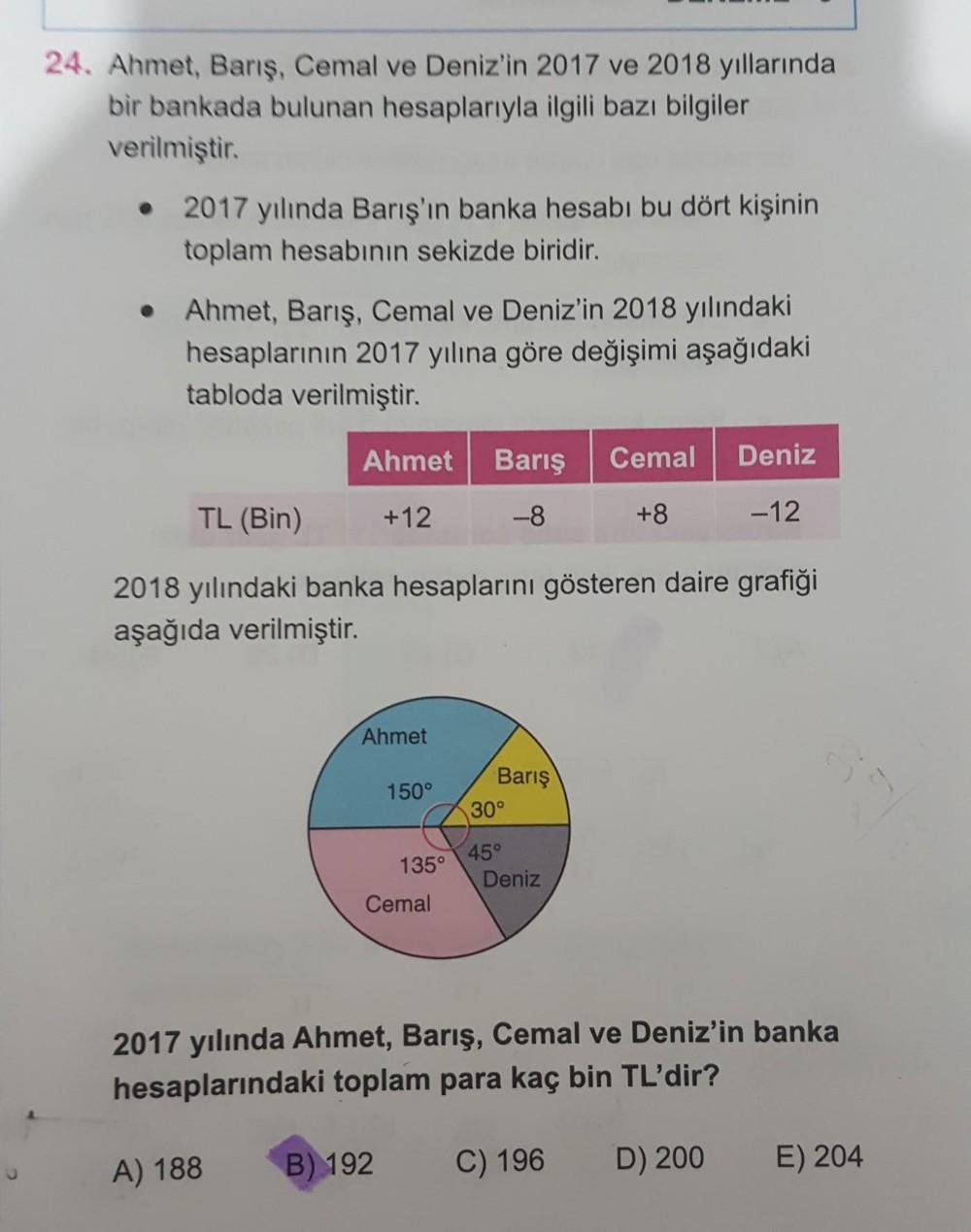 24. Ahmet, Barış, Cemal ve Deniz'in 2017 ve 2018 yıllarında bir bankada bulunan hesaplarıyla ilgili bazı bilgiler verilmiştir. 2017 yılında Barış'ın banka hesabı bu dört kişinin toplam hesabının sekizde biridir. Ahmet, Barış, Cemal ve Deniz'in 2018 yılındaki hesaplarının 2017 yılına göre değişimi aşağıdaki tabloda verilmiştir. Ahmet Barış Cemal Deniz TL (Bin) +12 -8 +8 - 12 2018 yılındaki banka hesaplarını gösteren daire grafiği aşağıda verilmiştir. Ahmet 150° Barış 30° 135° 45° Deniz Cemal 2017 yılında Ahmet, Barış, Cemal ve Deniz'in banka hesaplarındaki toplam para kaç bin TL'dir? A) 188 B) 192 C) 196 D) 200 E) 204