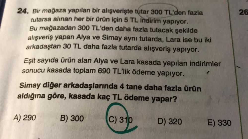 24. Bir mağaza yapılan bir alışverişte tutar 300 TL'den fazla tutarsa alınan her bir ürün için 5 TL indirim yapıyor. Bu mağazadan 300 TL'den daha fazla tutacak şekilde alışveriş yapan Alya ve Simay aynı tutarda, Lara ise bu iki arkadaştan 30 TL daha fazla tutarda alışveriş yapıyor. Eşit sayıda ürün alan Alya ve Lara kasada yapılan indirimler sonucu kasada toplam 690 TL'lik ödeme yapıyor. Simay diğer arkadaşlarında 4 tane daha fazla ürün aldığına göre, kasada kaç TL ödeme yapar? A) 290 B) 300 C) 310 D) 320 E) 330 26