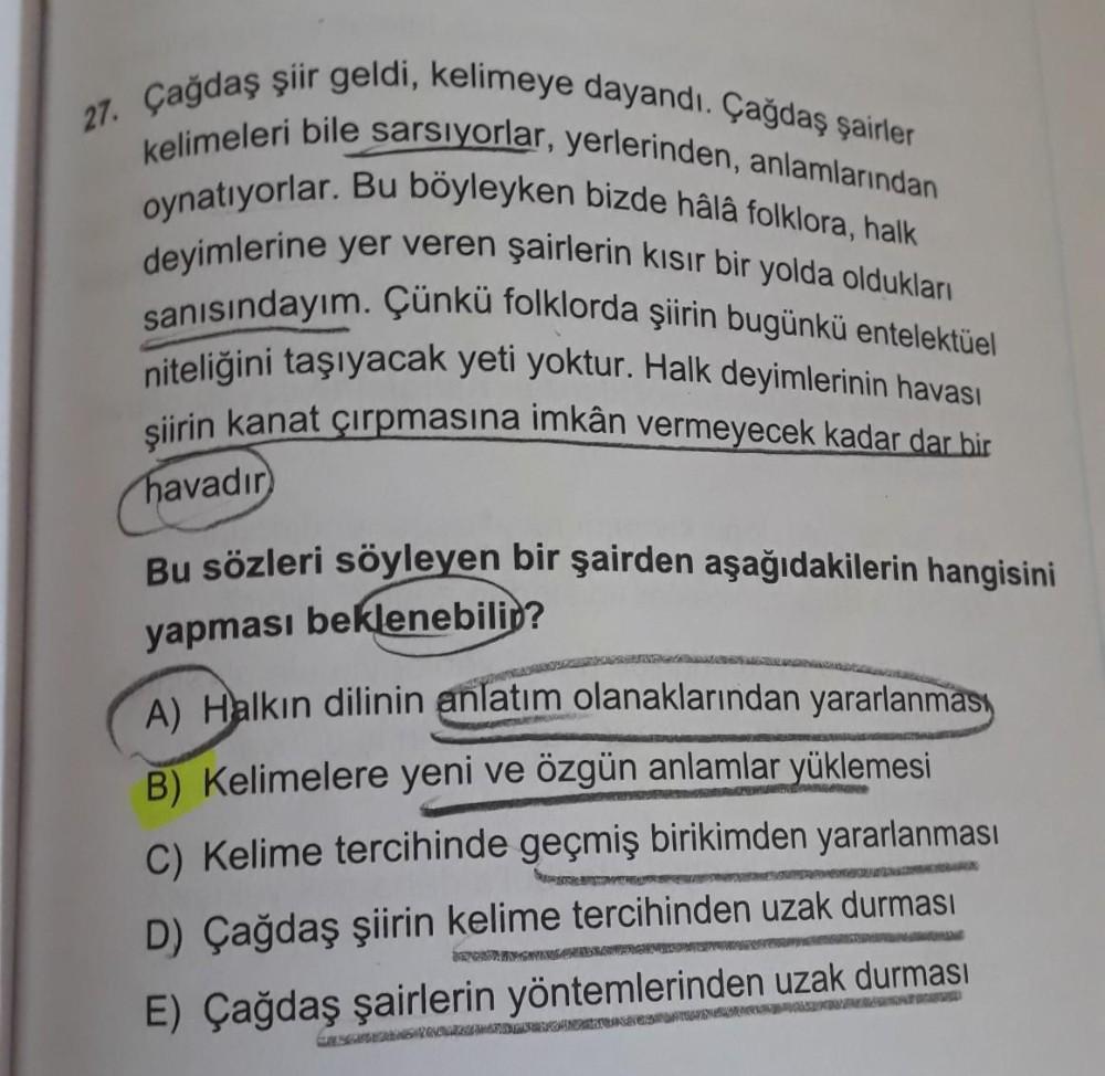 27. Çağdaş şiir geldi, kelimeye dayandı. Çağdaş şairler kelimeleri bile sarsıyorlar, yerlerinden, anlamlarından oynatıyorlar. Bu böyleyken bizde hâlâ folklora, halk deyimlerine yer veren şairlerin kısır bir yolda oldukları sanısındayım. Çünkü folklorda şiirin bugünkü entelektüel niteliğini taşıyacak yeti yoktur. Halk deyimlerinin havası şiirin kanat çırpmasına imkan vermeyecek kadar dar bir havadır Bu sözleri söyleyen bir şairden aşağıdakilerin hangisini yapması beklenebili? A) Halkın dilinin anlatım olanaklarından yararlanması B) Kelimelere yeni ve özgün anlamlar yüklemesi C) Kelime tercihinde geçmiş birikimden yararlanması D) Çağdaş şiirin kelime tercihinden uzak durması E) Çağdaş şairlerin yöntemlerinden uzak durması GESCHLOSS