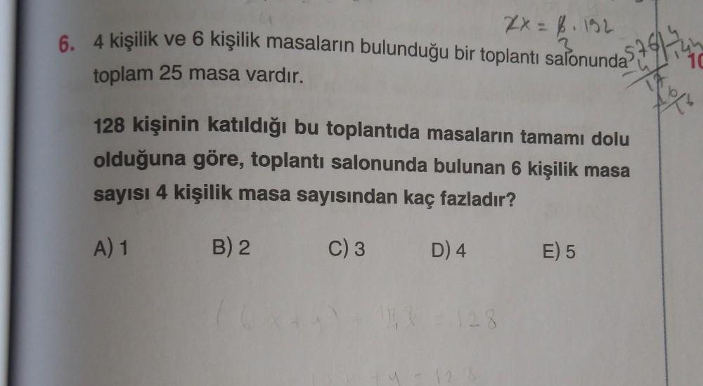 2x = 8.192 6. 4 kişilik ve 6 kişilik masaların bulunduğu bir toplantı salonunda toplam 25 masa vardır. 128 kişinin katıldığı bu toplantıda masaların tamamı dolu olduğuna göre, toplantı salonunda bulunan 6 kişilik masa sayısı 4 kişilik masa sayısından kaç fazladır? A) 1 B) 2 C) 3 D) 4 128 128 25761-741 LA E) 5 10