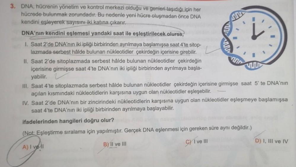 3. DNA, hücrenin yönetim ve kontrol merkezi olduğu ve genleri taşıdığı için her hücrede bulunmak zorundadır. Bu nedenle yeni hücre oluşmadan önce DNA kendini eşleyerek sayısını iki katına çıkarır. DNA'nın kendini eşlemesi yandaki saat ile eşleştirilecek olursa, 1 1. Saat 2'de DNA'nın iki ipliği birbirinden ayrılmaya başlamışsa saat 4'te sitop- lazmada serbest hâlde bulunan nükleotidler çekirdeğin içerisine girebilir. II. Saat 2'de sitoplazmada serbest hâlde bulunan nükleotidler çekirdeğin içerisine girmişse saat 4'te DNA'nın iki ipliği birbirinden ayrılmaya başla- yabilir. III. Saat 4'te sitoplazmada serbest hâlde bulunan nükleotidler çekirdeğin içerisine girmişse saat 5'te DNA'nın açılan kısmındaki nükleotidlerin karşısına uygun olan nükleotidler eşleşebilir. IV. Saat 2'de DNA'nın bir zincirindeki nükleotidlerin karşısına uygun olan nükleotidler eşleşmeye başlamışsa saat 4'te DNA'nın iki ipliği birbirinden ayrılmaya başlayabilir. ifadelerinden hangileri doğru olur? (Not: Eşleştirme sıralama için yapılmıştır. Gerçek DNA eşlenmesi için gereken süre aynı değildir.) SY I ve III D) I, III ve IV A) I ve II B) II ve III