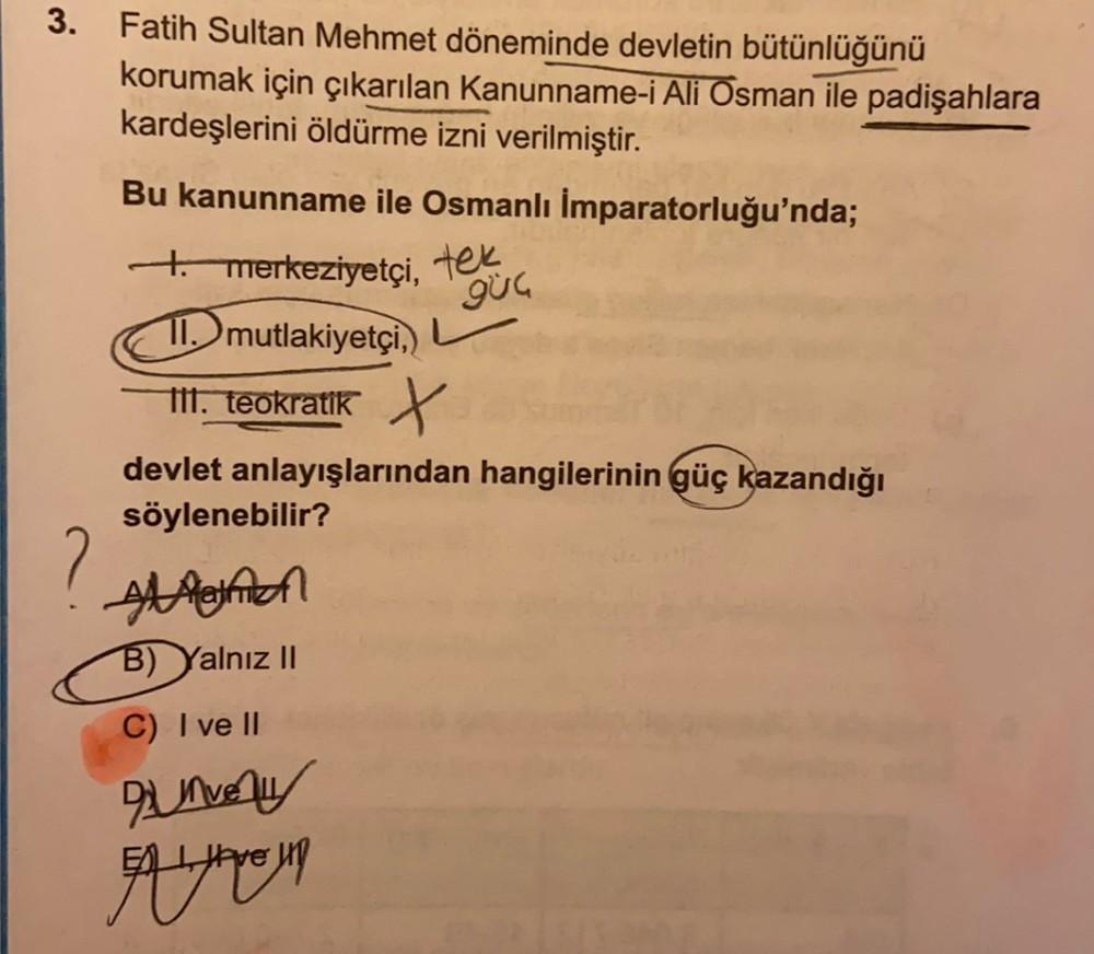 3. Fatih Sultan Mehmet döneminde devletin bütünlüğünü korumak için çıkarılan Kanunname-i Ali Osman ile padişahlara kardeşlerini öldürme izni verilmiştir. Bu kanunname ile Osmanlı İmparatorluğu'nda; t merkeziyetçi, tek 11. mutlakiyetçi, tit. teokratik x devlet anlayışlarından hangilerinin güç kazandığı söylenebilir? güc ? smanian B) Yalnız II C) I ve II gunew way I Have W