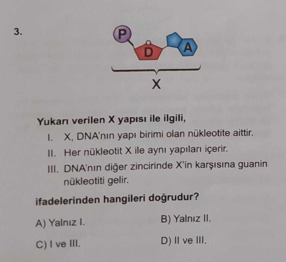 3. P D A x Yukarı verilen X yapısı ile ilgili, 1. X, DNA'nın yapı birimi olan nükleotite aittir. II. Her nükleotit X ile aynı yapıları içerir. III. DNA'nın diğer zincirinde X'in karşısına guanin nükleotiti gelir. ifadelerinden hangileri doğrudur? A) Yalnız I. B) Yalnız II. C) I ve III. D) II ve III.