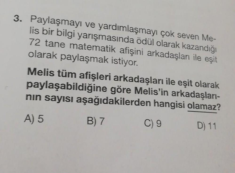 3. Paylaşmayı ve yardımlaşmayı çok seven Me- lis bir bilgi yarışmasında ödül olarak kazandığı 72 tane matematik afişini arkadaşları ile eşit olarak paylaşmak istiyor. Melis tüm afişleri arkadaşları ile eşit olarak paylaşabildiğine göre Melis'in arkadaşları- nin sayısı aşağıdakilerden hangisi olamaz? A) 5 B) 7 C) 9 D) 11
